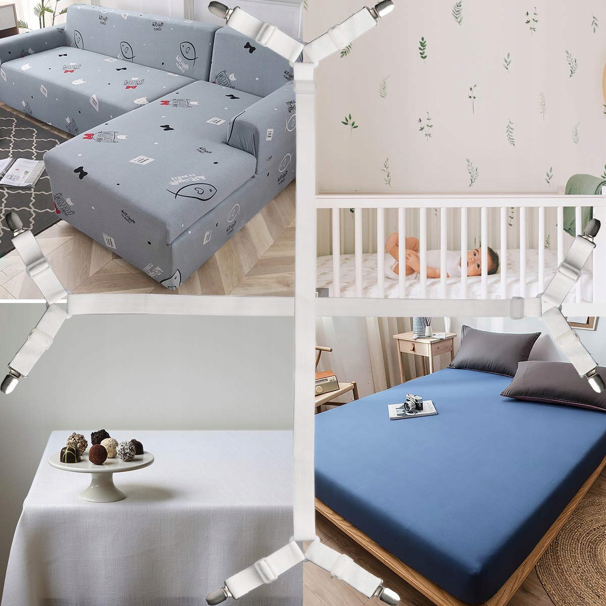 ЗАЖИМЫ ДЛЯ РЕМНЕЙ ДЛЯ КРОВАТИ: крепко держите простыни всю ночь напролет, держите кровать в идеальном состоянии. Никогда больше не беспокойтесь о грязном или смятом постельном белье. Сделайте свою жизнь проще; зажимы для скатертей; держатель листов, ремни держателей листов, угловые зажимы листов, поручни, регулируемые эластичные ремни листов, захваты, крепления листов; Листовые ремни для отдыха на природе