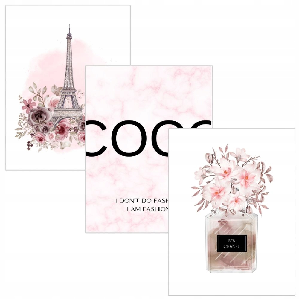 Три идеально комбинированных плаката в стиле гламура с изображением Эйфелевой башни, надпись коко на мраморном фоне и духов с цветами. Цвета плакатов в оттенках розового. Эти плакаты являются отличной идеей для оформления стен, соответствующих любому дизайну интерьера. Набор плакатов будет изолировать комнату, создавать уютную и домашнюю атмосферу.