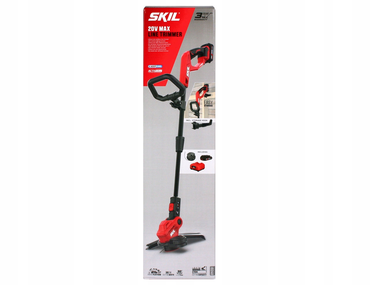 Беспроводной триммер SKIL модели 0240 от RED Line с шириной стрижки 30 см для удобной стрижки травы по горизонтали и вертикали.