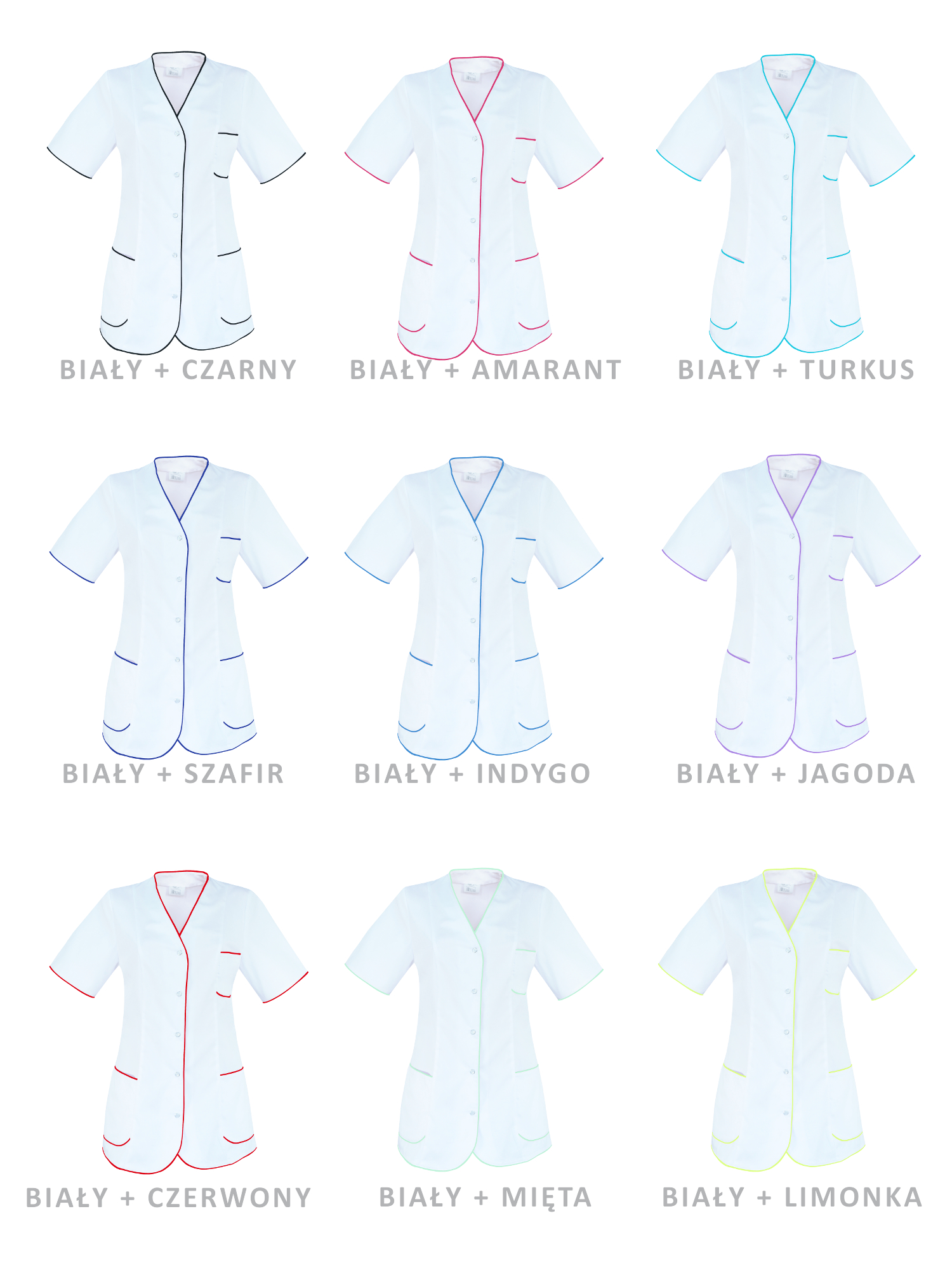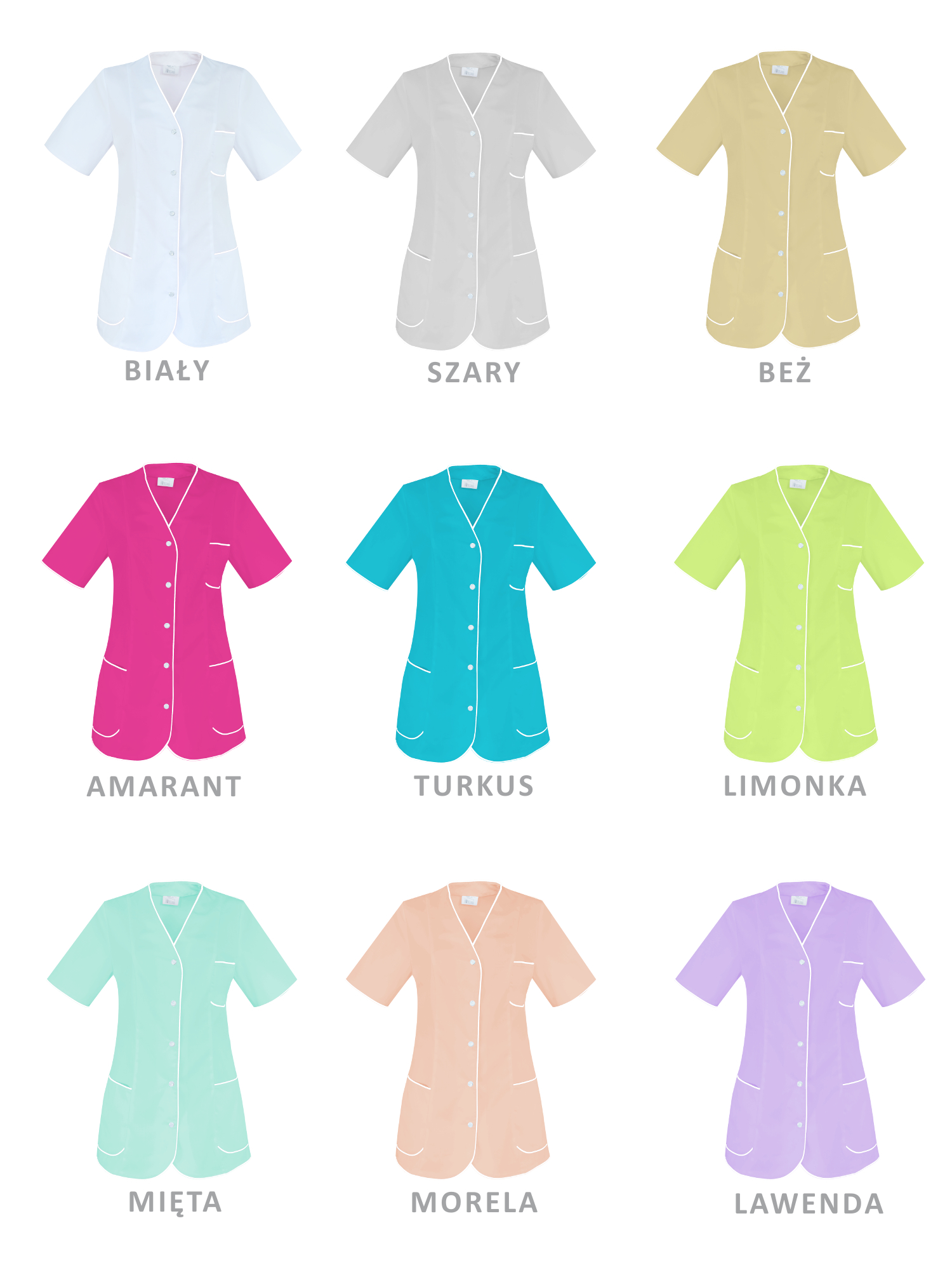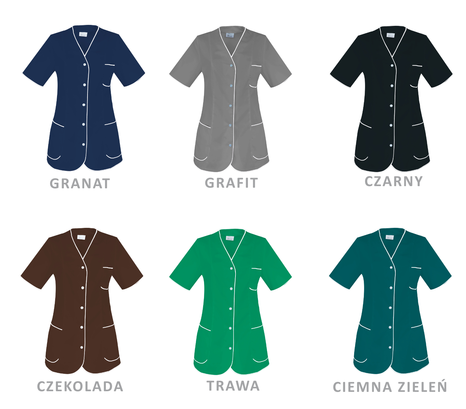 Медицинский, косметический, спа, женские с коротким рукавом. Приспособленный вырез, подчеркивающий фигуру. Длина куртки составляет 70 см. Закрепленные кнопками (схемы). Мы гарантируем высокий комфорт использования. Электронная почта
