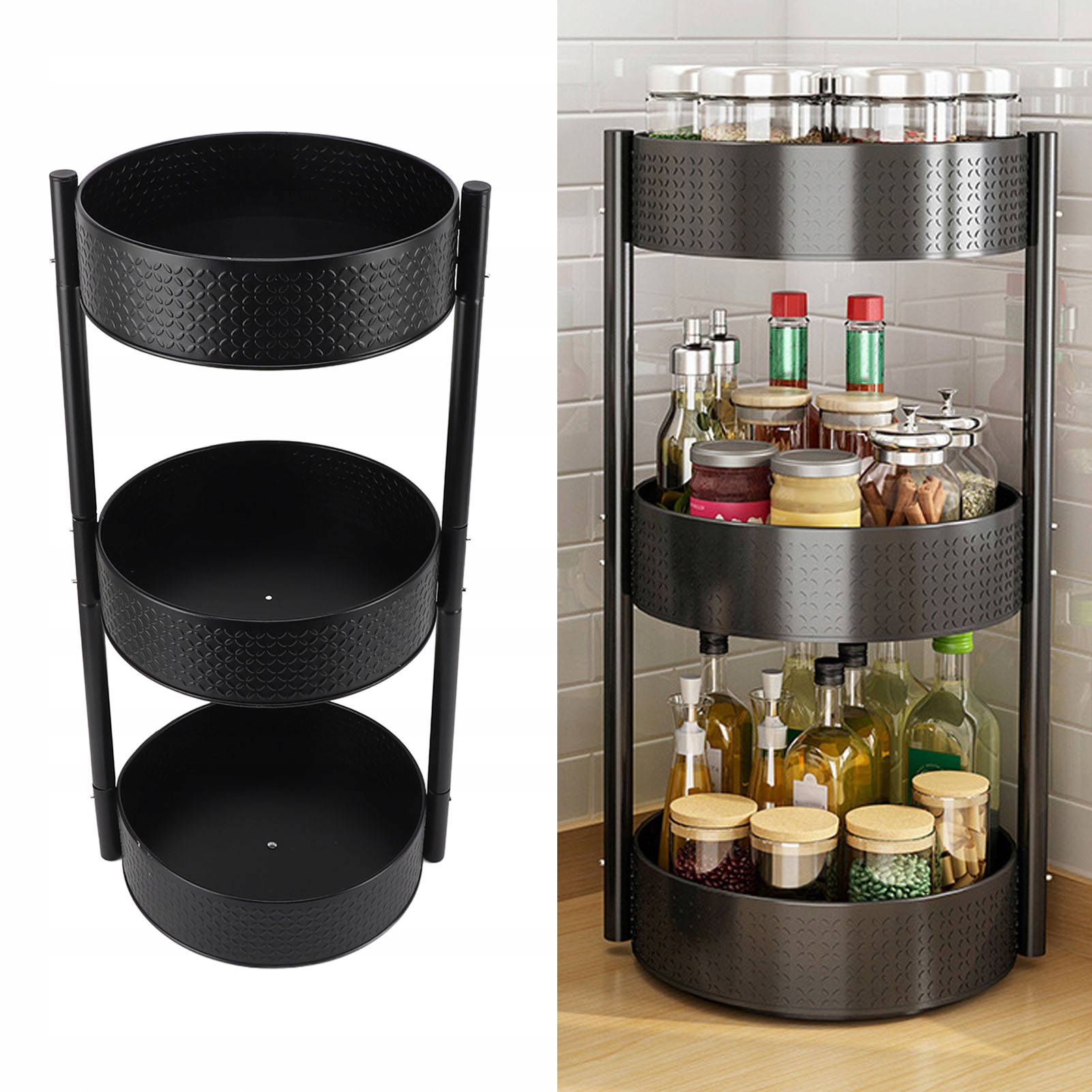 Функция: 1. Большая емкость: полка специй на поворотном столе обеспечивает много места для хранения, что позволяет вам организовать беспорядок на кухне и сохранять порядок в специях и других объектах.