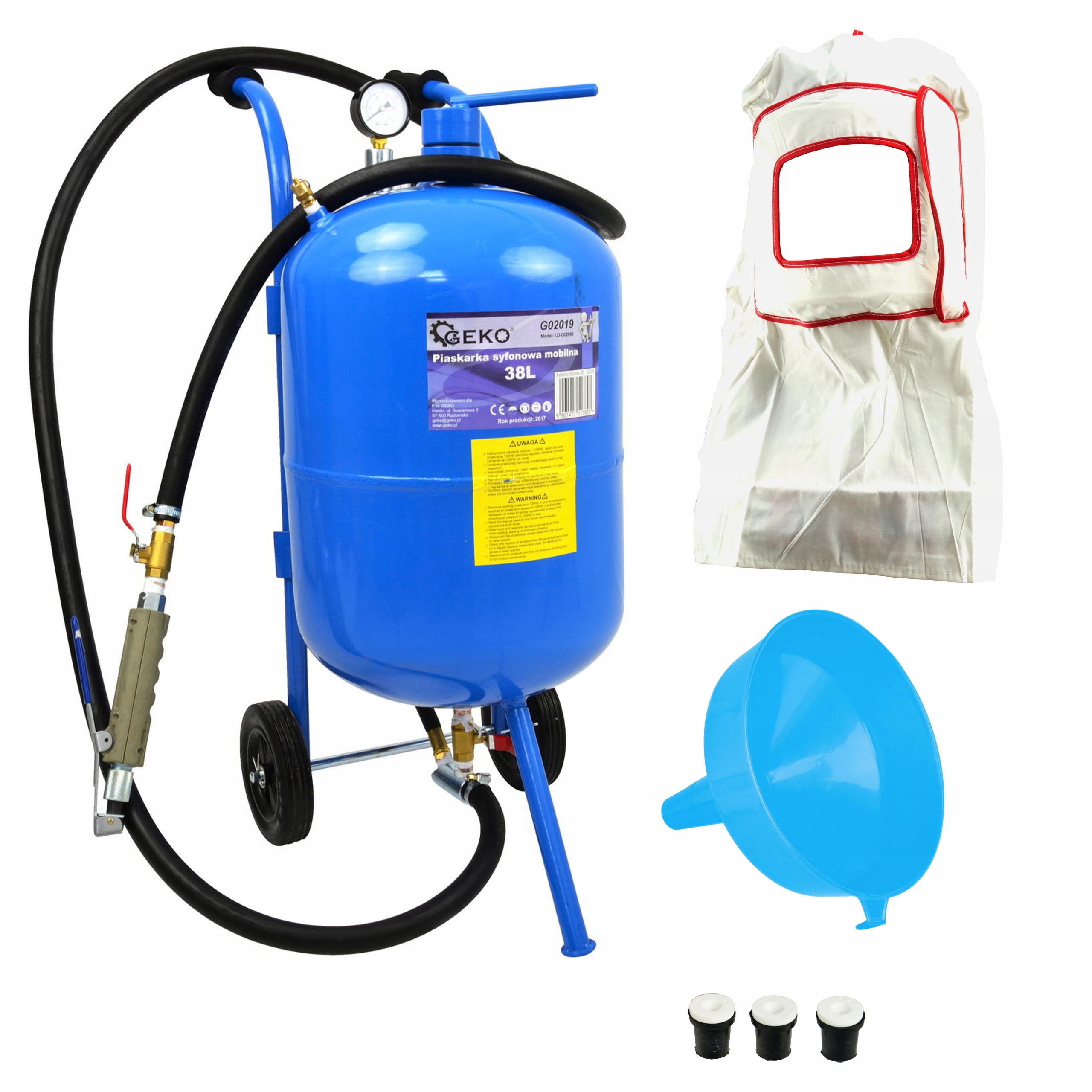 Передвижной напорный пескоструйный аппарат (сифон) емкостью 38 литров. Он идеально подходит для ремонта, технического обслуживания, кузовных и механических работ, а также на производственных предприятиях. Оснащен насадками и пескоструйным пистолетом, запорным клапаном, манометром, пескоструйным шлангом, воронкой для заполнения бака и защитной маской с окошком из оргстекла.