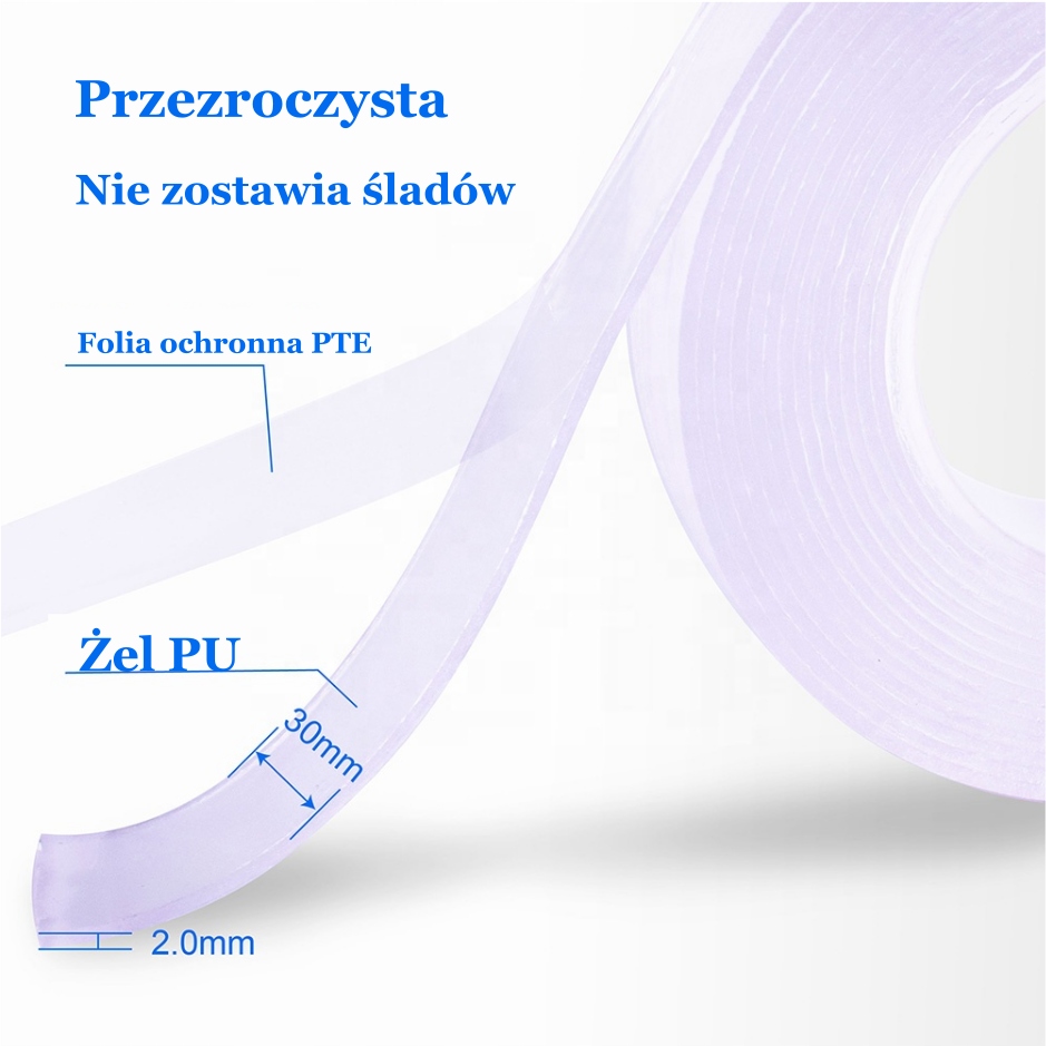 Лента прозрачна. Его можно использовать на различных гладких непористых поверхностях, таких как стекло, мрамор, металл, керамическая плитка, пластик или кожа, стены, окна, двери, столешница, кухонные шкафы и др. Является альтернативой двусторонним булавкам. лента, а также гвозди и дюбели.