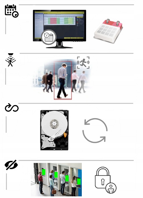 Выберите один из шести типов событий, которые запускают запись (непрерывная, событие, обнаружение движения, тревога, движение и тревога, движение или тревога) и свободно выбирайте материалы, которые вас интересуют. Выберите дни и часы записи, добавьте праздники и исключения, чтобы сэкономить свое драгоценное время и место на жестком диске.