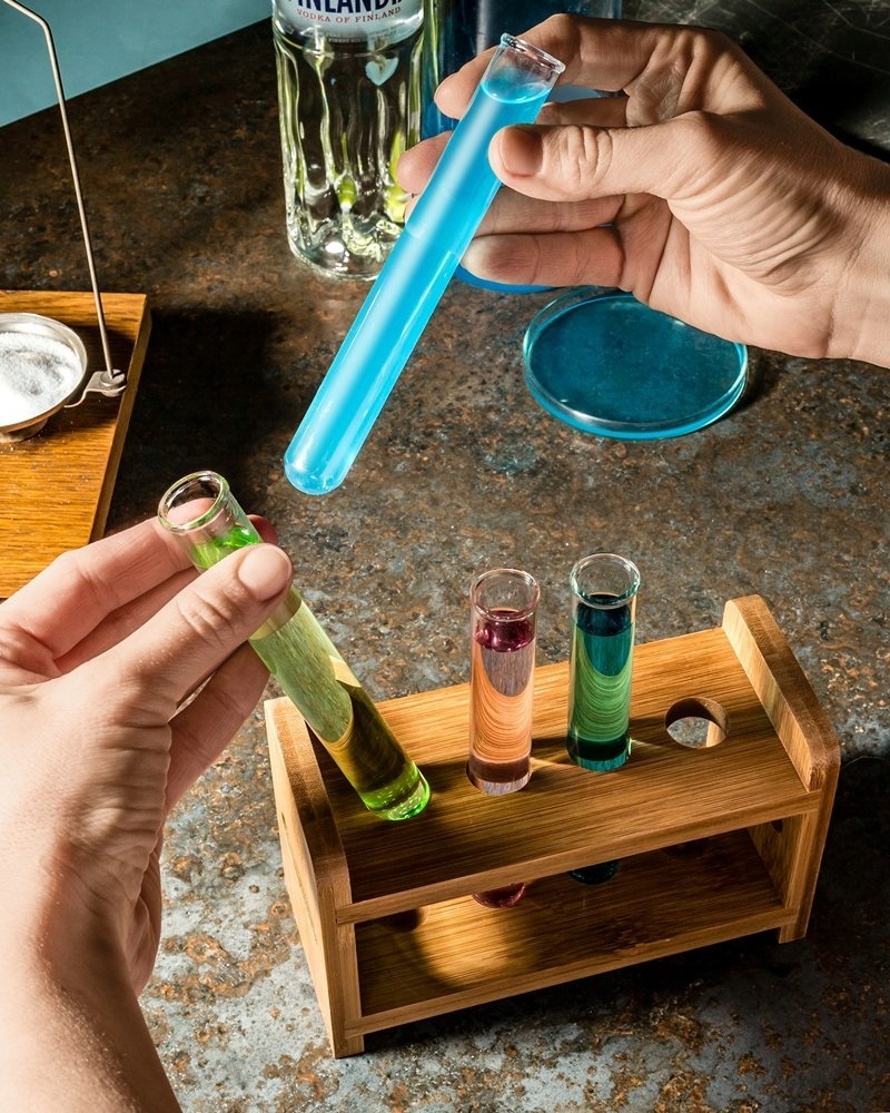 Когда вечеринка, то не может быть скучно, когда дело доходит до очков, то не обязательно скучно ;) И вот какие наши... пробирки для вечеринок, веселые и в то же время практичная альтернатива обычным очкам. На аккуратной бамбуковой подставке есть место для четырех пробирок подходящего размера, в которые вы можете наполнить напитки по своему вкусу и усмотрению, а затем элегантно их выставить. Моя рука так и тянется к такой пробирке, полной весёлых и красочных процентов :)