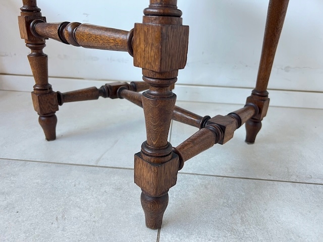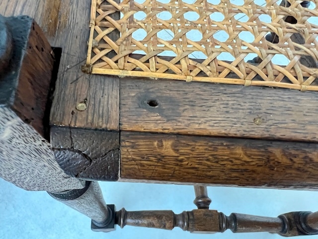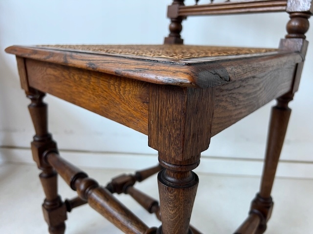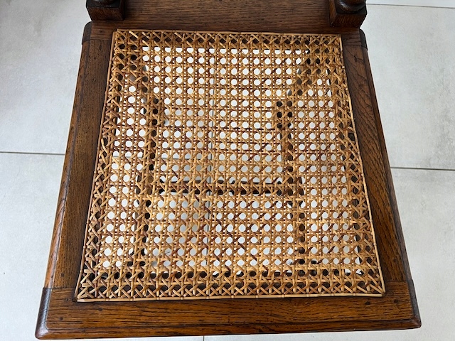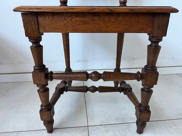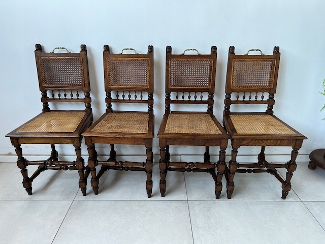 Четыре дубовых стулья. Они сделаны в стиле Генриковски. По нашим оценкам, им около 100 лет. Защиты и сиденья плетены от рафии. Стулья сохраняются в хорошем состоянии. У них нет повреждений или полостей. Они все стабильны. Они готовы вставить.