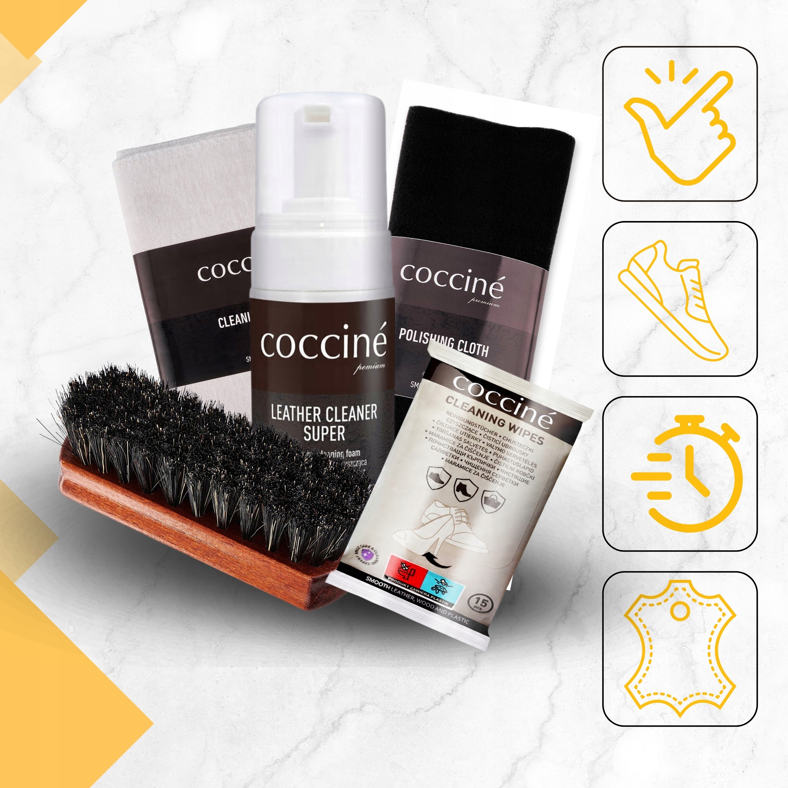 Coccine Clean Wipe Очистка носовой платок - это незаменимый гаджет в вашей сумке или кармане. Благодаря этому вы всегда будете готовы к неожиданным местам и грязи, заботясь об эстетическом виде кожаной обуви и аксессуаров. Ставки на удобство и эффективность - достижение проверенного продукта авторитетного бренда Coccine!