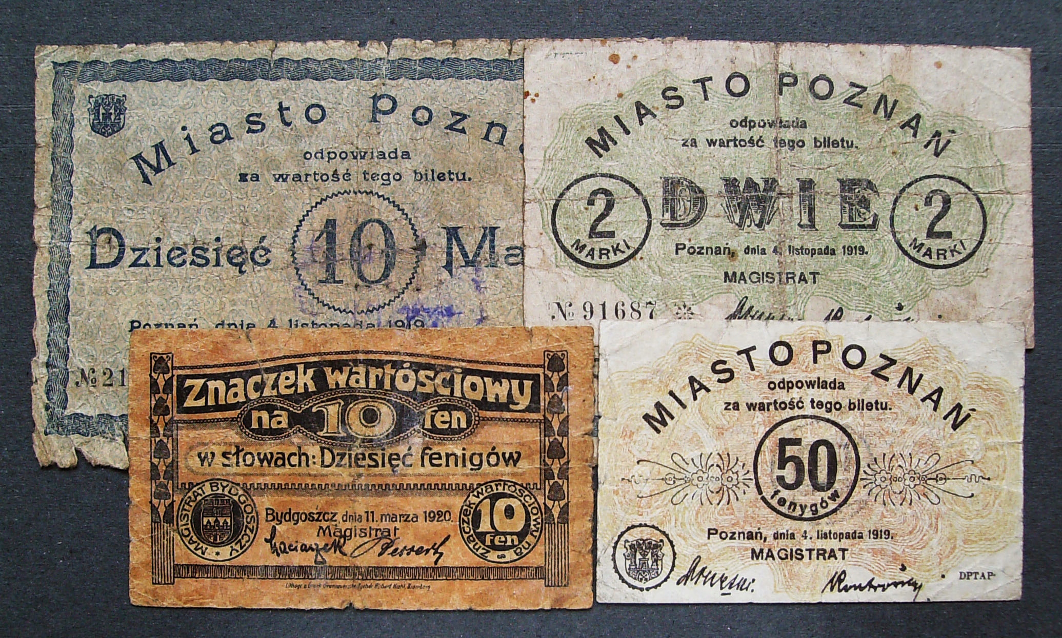 50 fenigów, 2 marki i 10 marek 1919 Poznań oraz 10 fenigów Bydgoszcz -1920