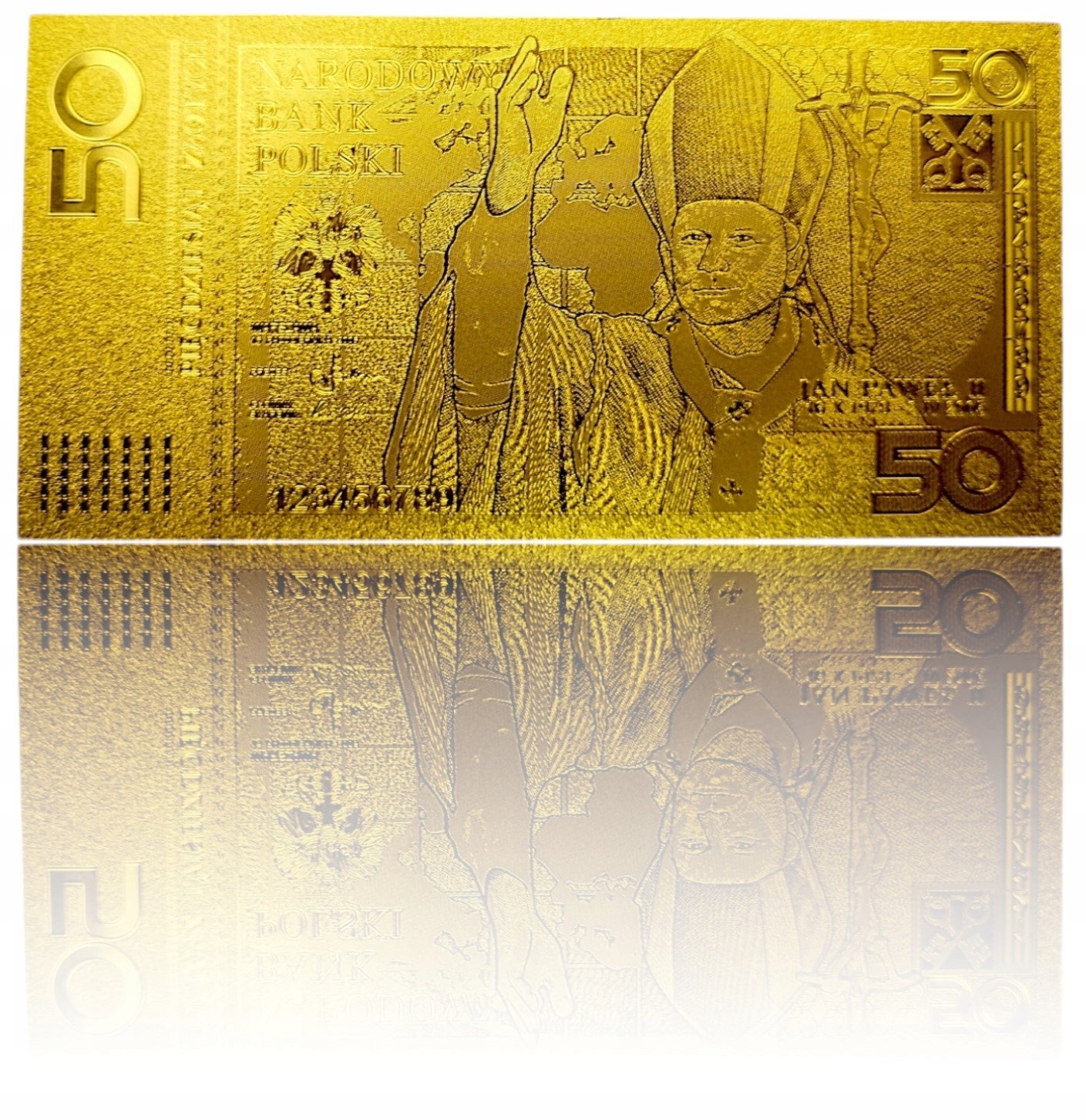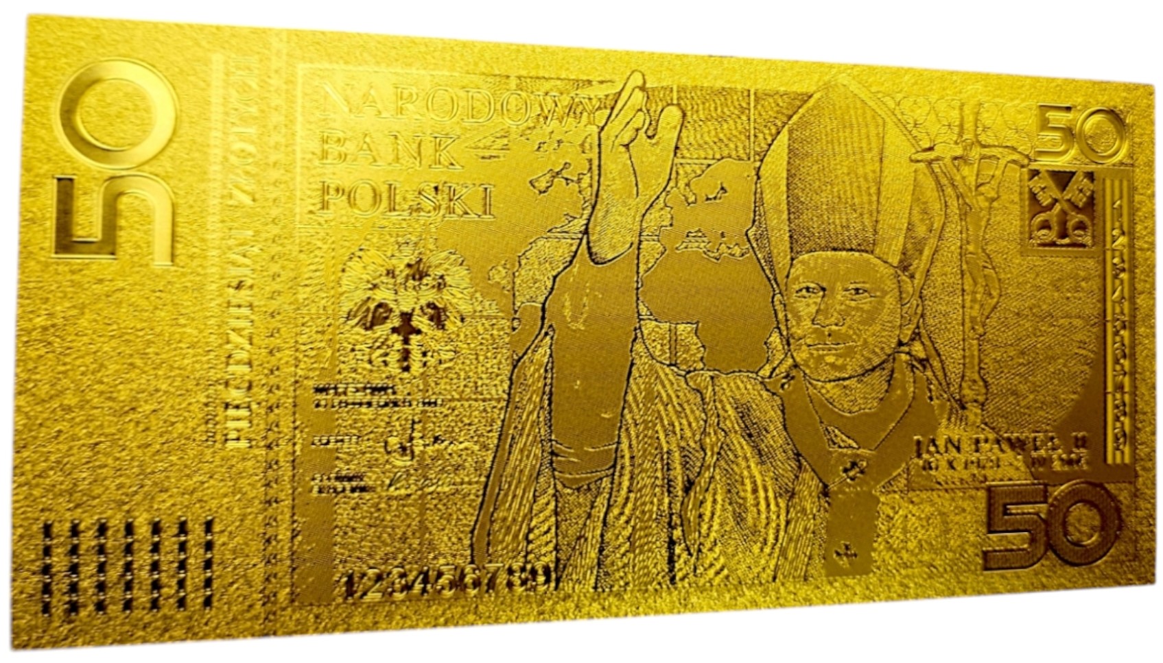 ПОЗОЛОЧЕННАЯ БАНКНОТА ПВХ 50 ЗОЛОТЫХ ИОАННА ПАВЛА II, ЗОЛОТАЯ ВЕРСИЯ