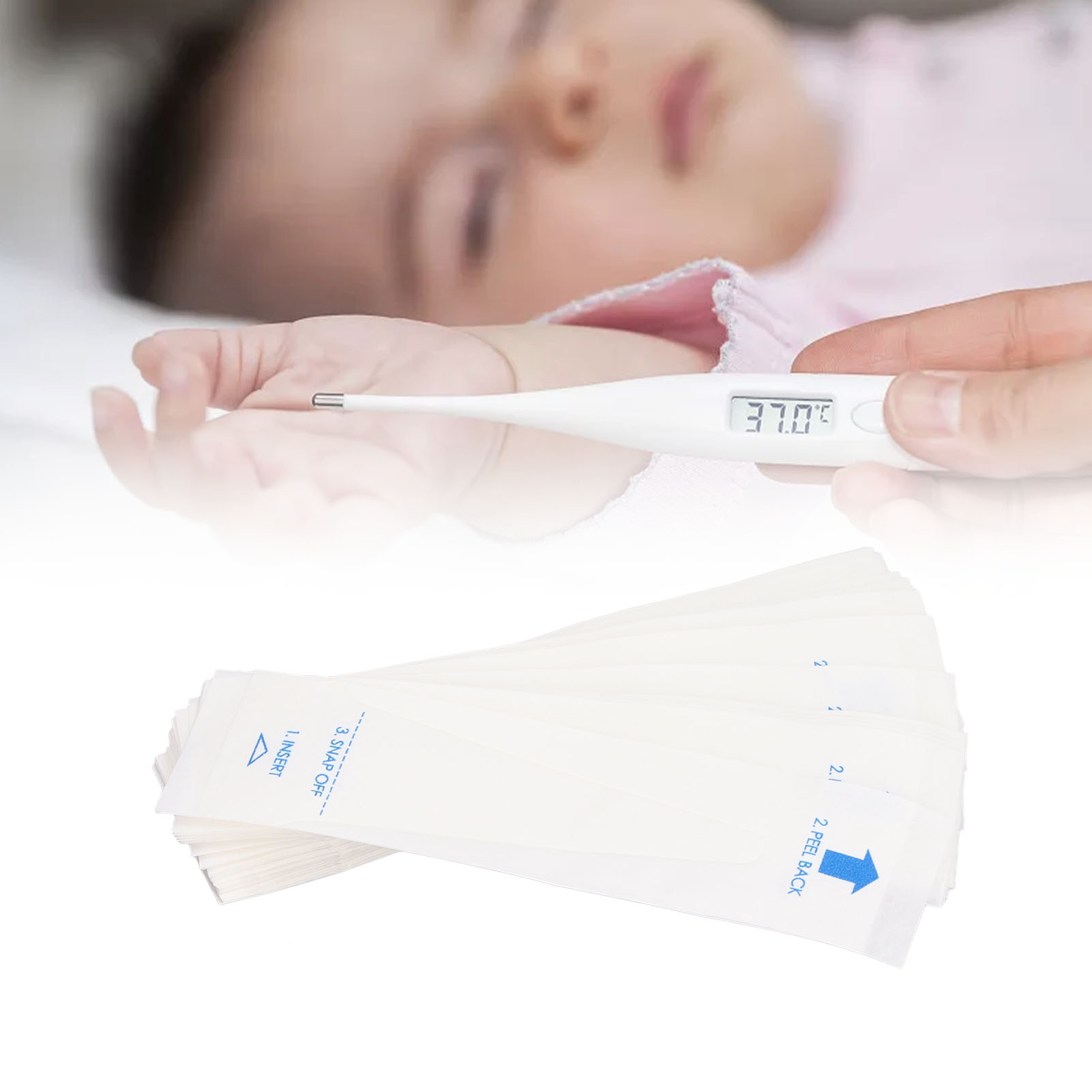 Функция: 1. Легко в использовании: просто вставьте зонд, разорвать переднюю и заднюю часть крышки для термометра и выбросить его после измерения температуры