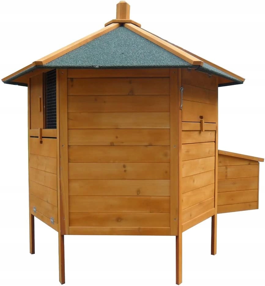 Деревянная крыша с прибором для курицы имеет водонепроницаемое защитное покрытие. Яичная полка (Nestbox) доступна снаружи. Над двери есть окно вентиляции, благодаря которому он всегда обеспечивает достаточно свежего воздуха. Благодаря предполагаемому расстоянию между землей и адским полом животные защищены от холода и влаги