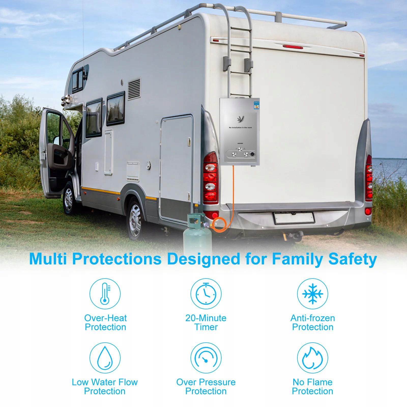 Этот водонагреватель оснащен такими методами, как защита температуры выше 75 ℃ (167 ° F), защита от низкого потока воды, защита от замерзания, защита от слишком высокой воды, защита от пламени, 20-минутный таймер и т. Д.