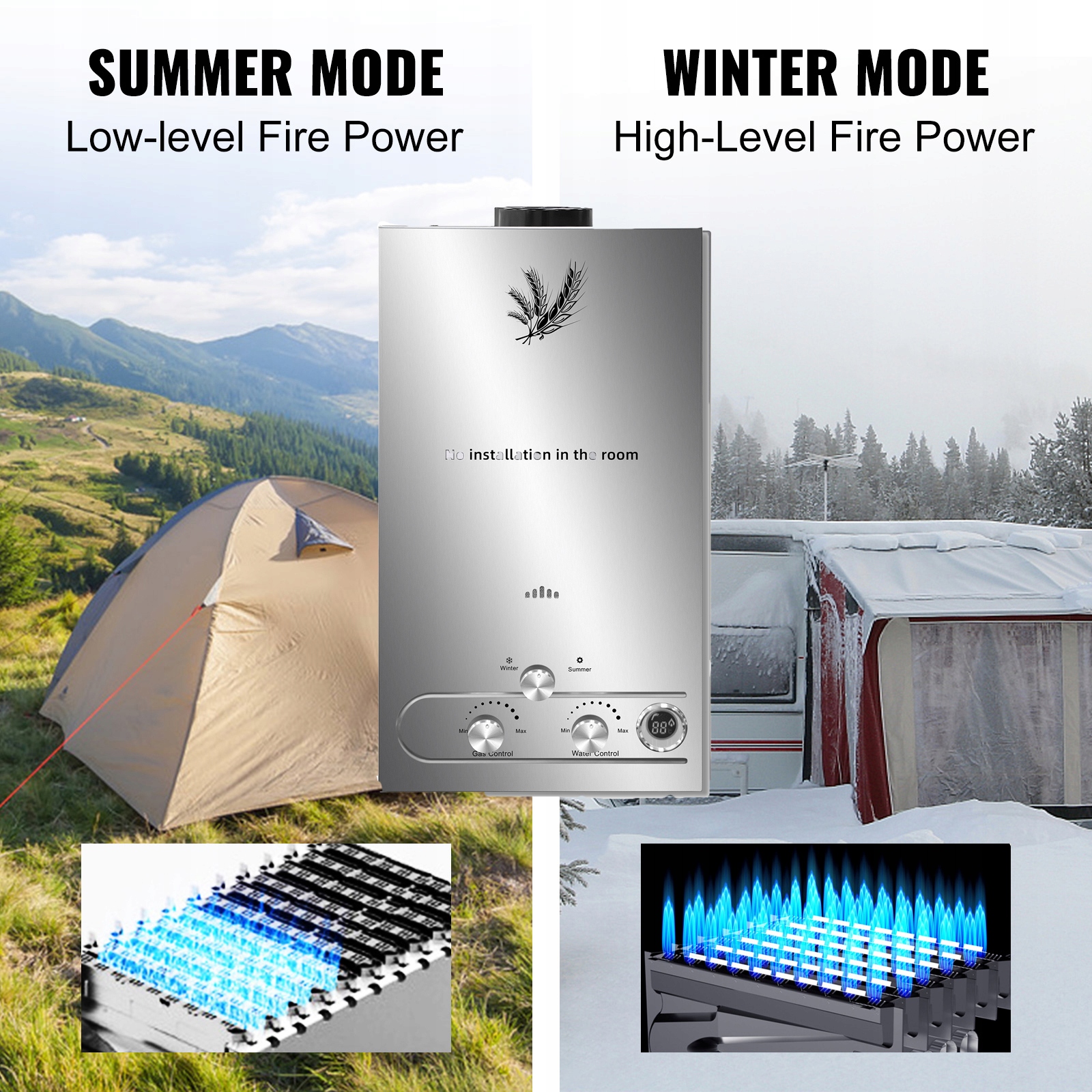 Этот продукт использует СНГ в качестве основного источника энергии и закрытого конструкции сгорания, чтобы обеспечить ровную эффективность огня и более высокого сгорания. Переключатель зимнего или летнего режима меняет последовательность огня, чтобы сохранить газ.