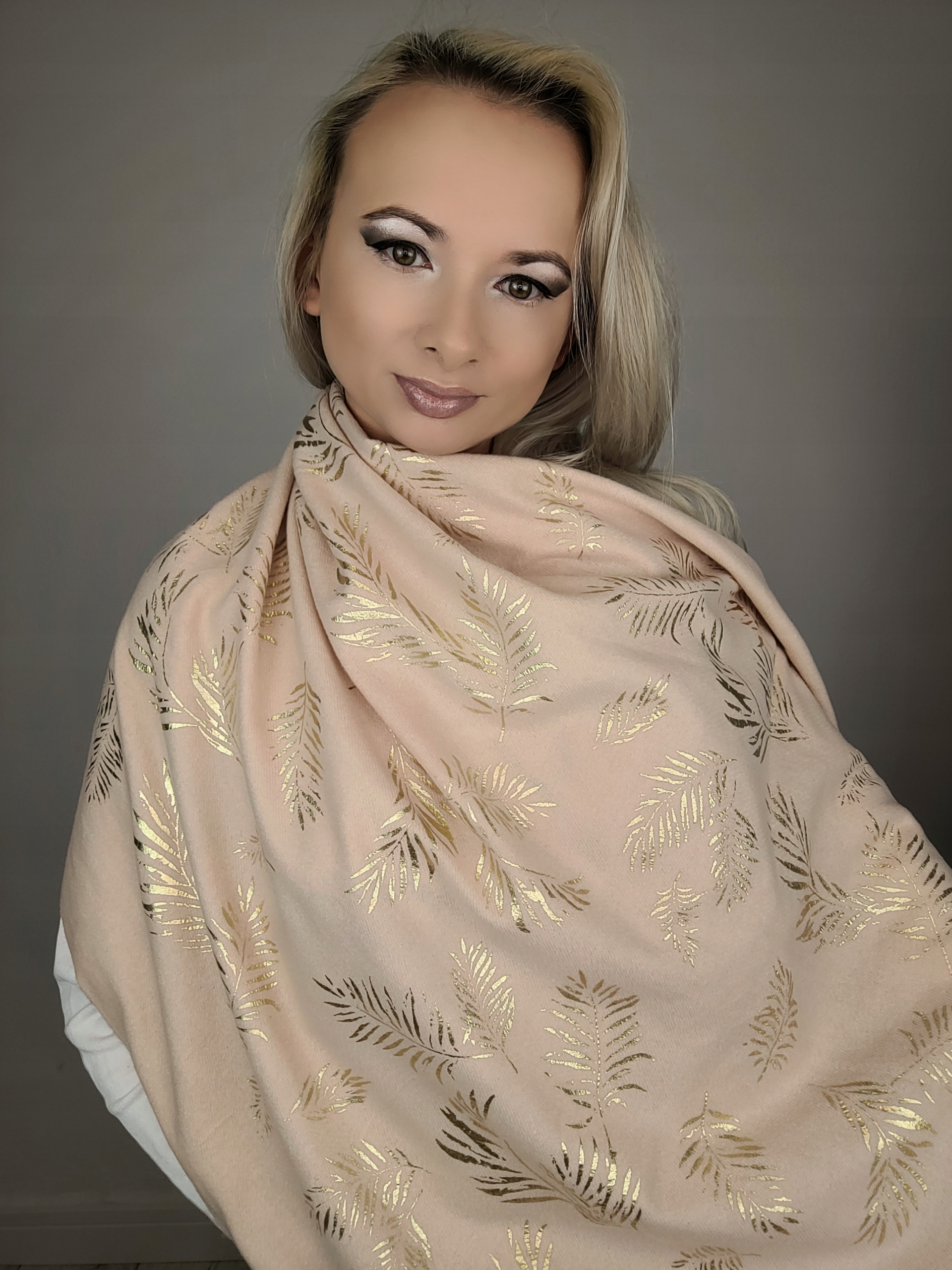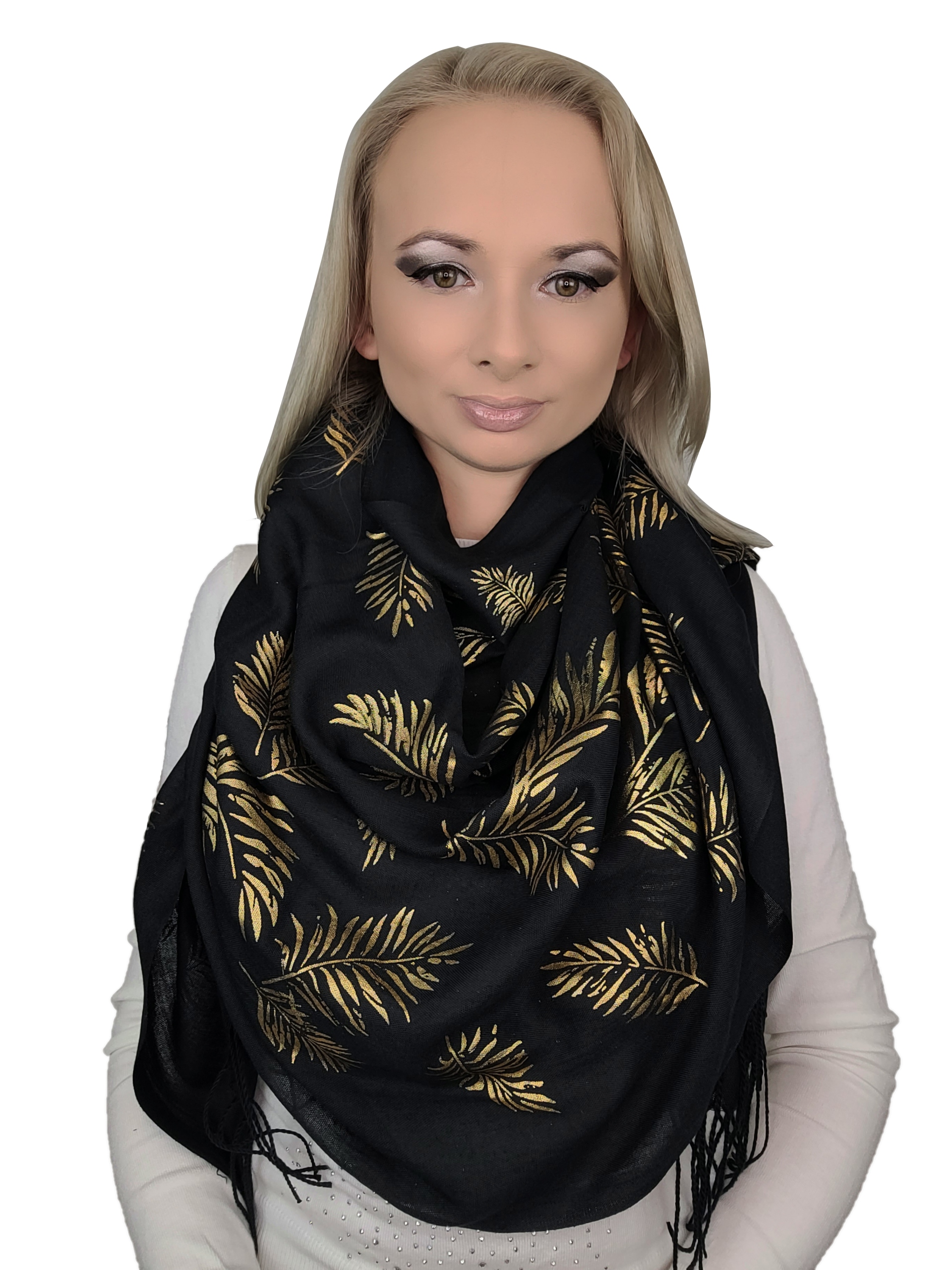 Последняя коллекция вискозных шарфов в черных, бежевых и пастельных тонах с примесей золотого украшения. Тепло очень приятно на ощупь и эффективно. Корочечные стороны заканчиваются полосами.