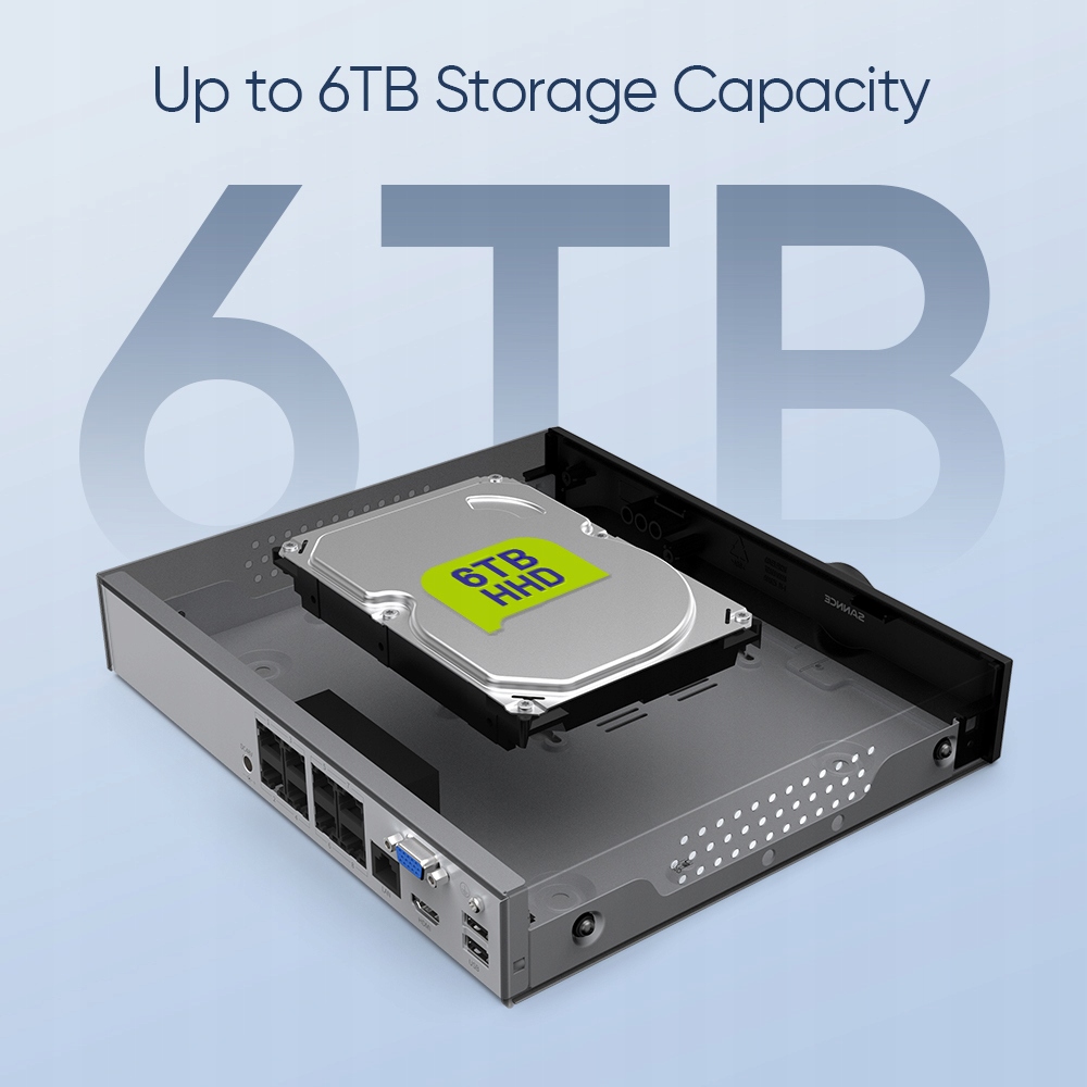 поддерживает один жесткий диск с максимальной емкостью 6 ТБ, обеспечивая достаточное количество памяти для долгосрочных записей и обеспечивая надежное хранение данных мониторинга.