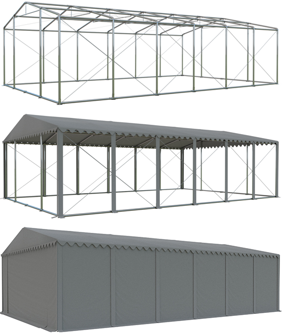 Преимуществом палаточного зала является особо прочная несущая конструкция на основе стальных труб диаметром ок. 50 мм, усилен стабильными стальными тросами и опорами для крыши и стен. Кроме того, вся конструкция оцинкована горячим способом. Такое решение защищает от коррозии, повышает прочность элементов конструкции и обеспечивает длительную эксплуатацию.