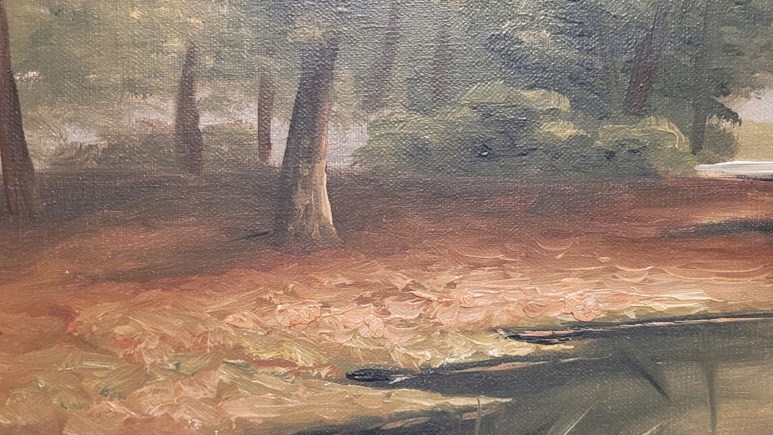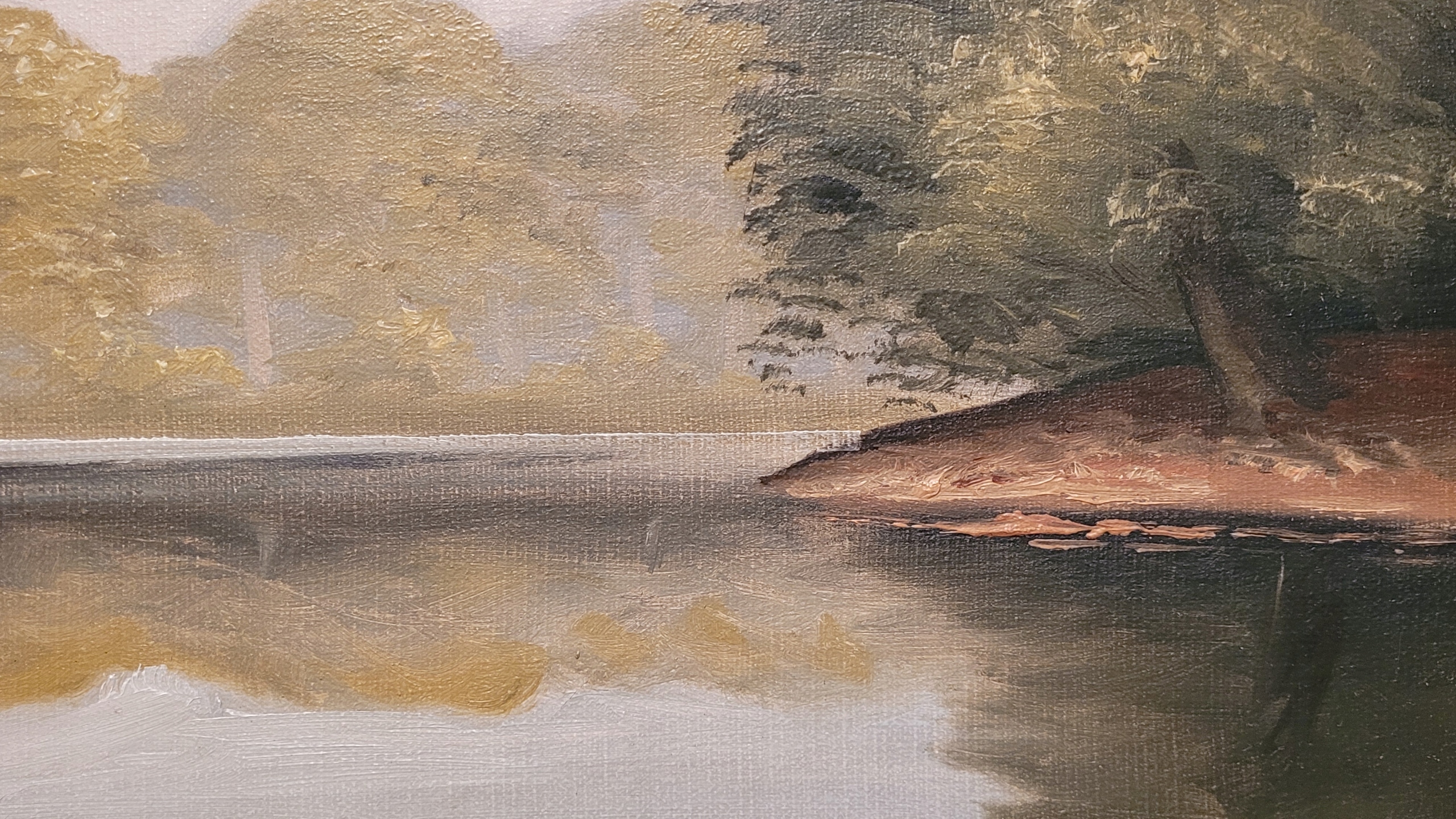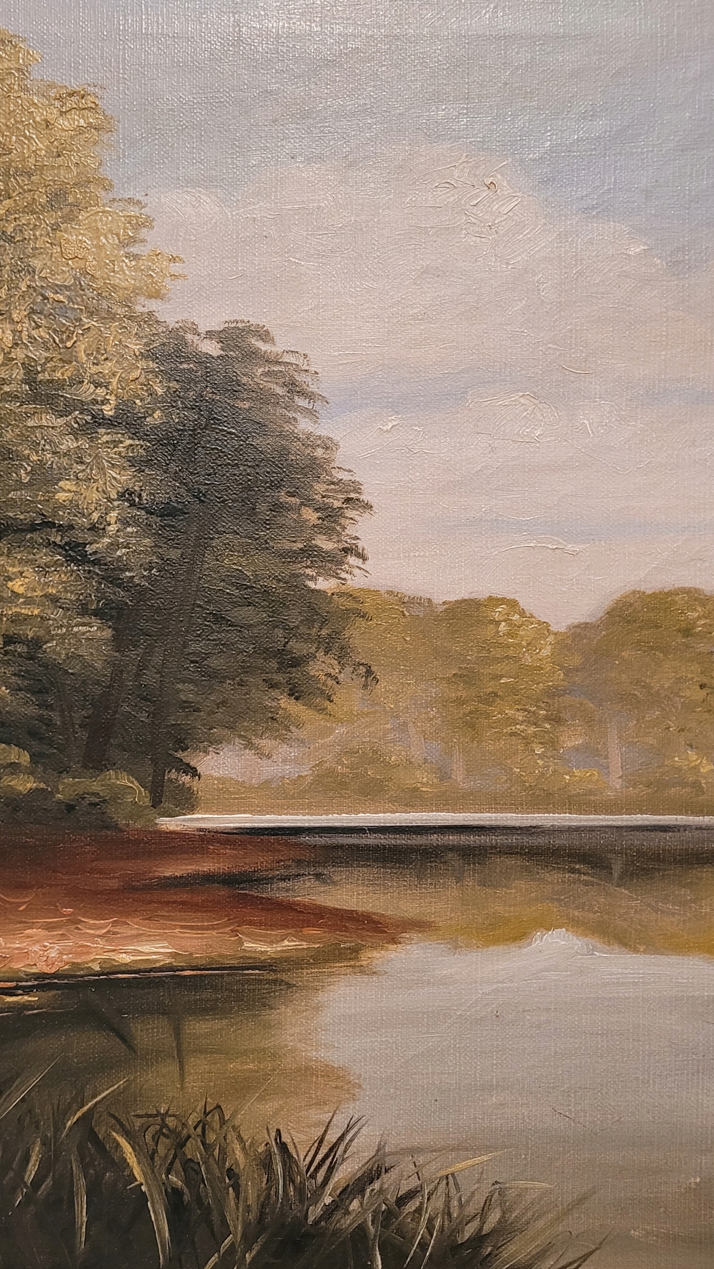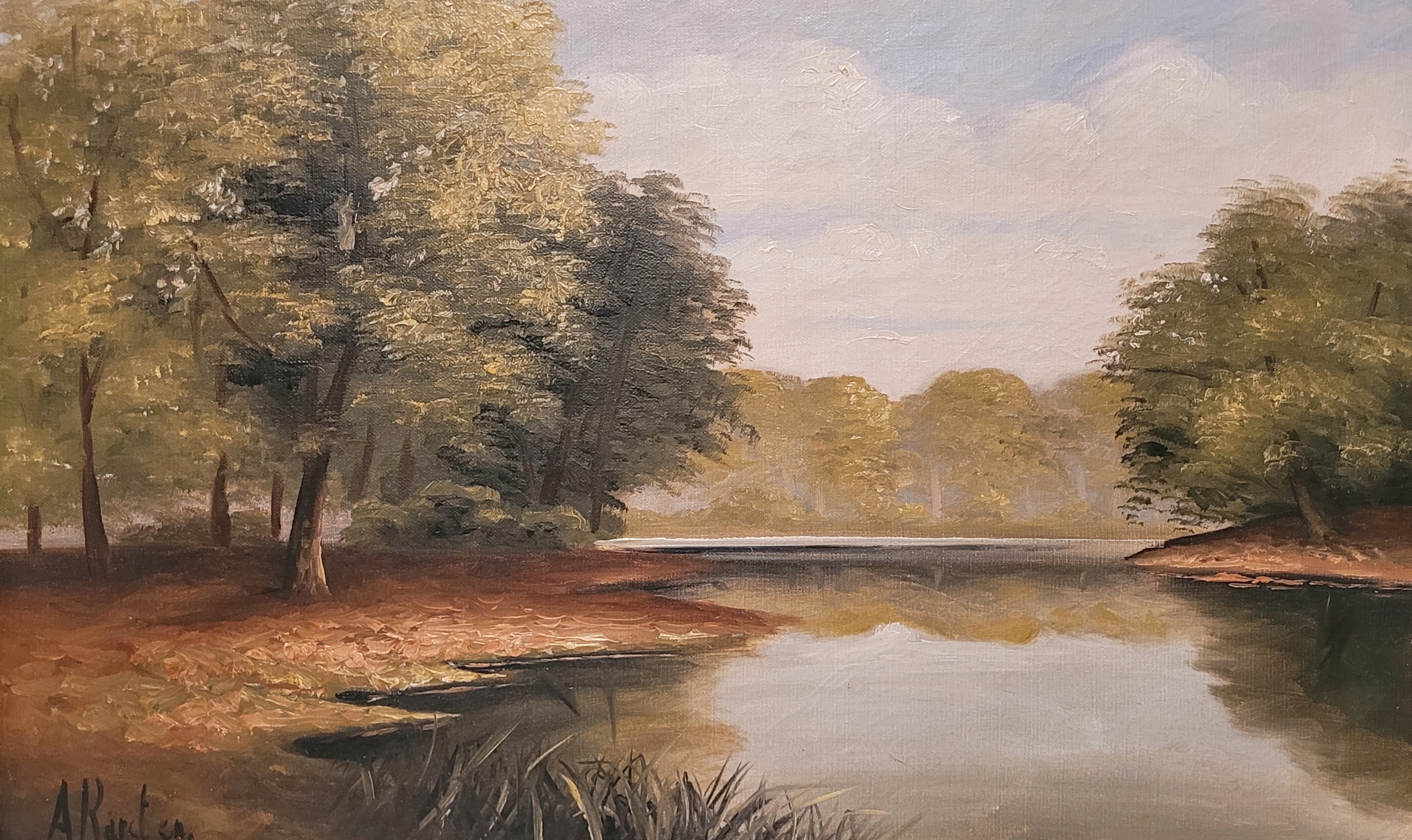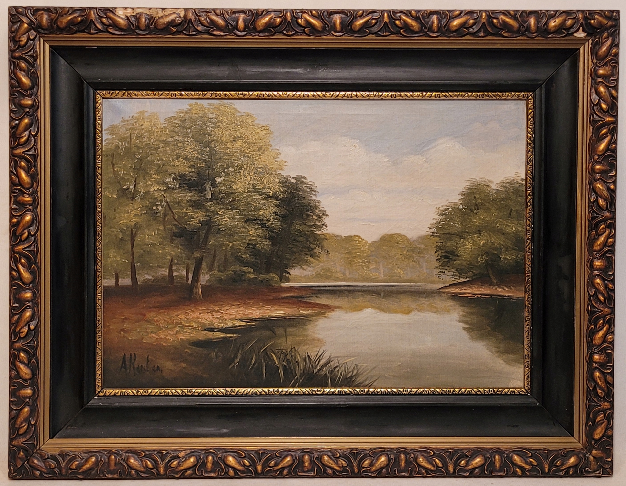 Тема продажи - красивая старая нефтяная картина «Лесное озеро».