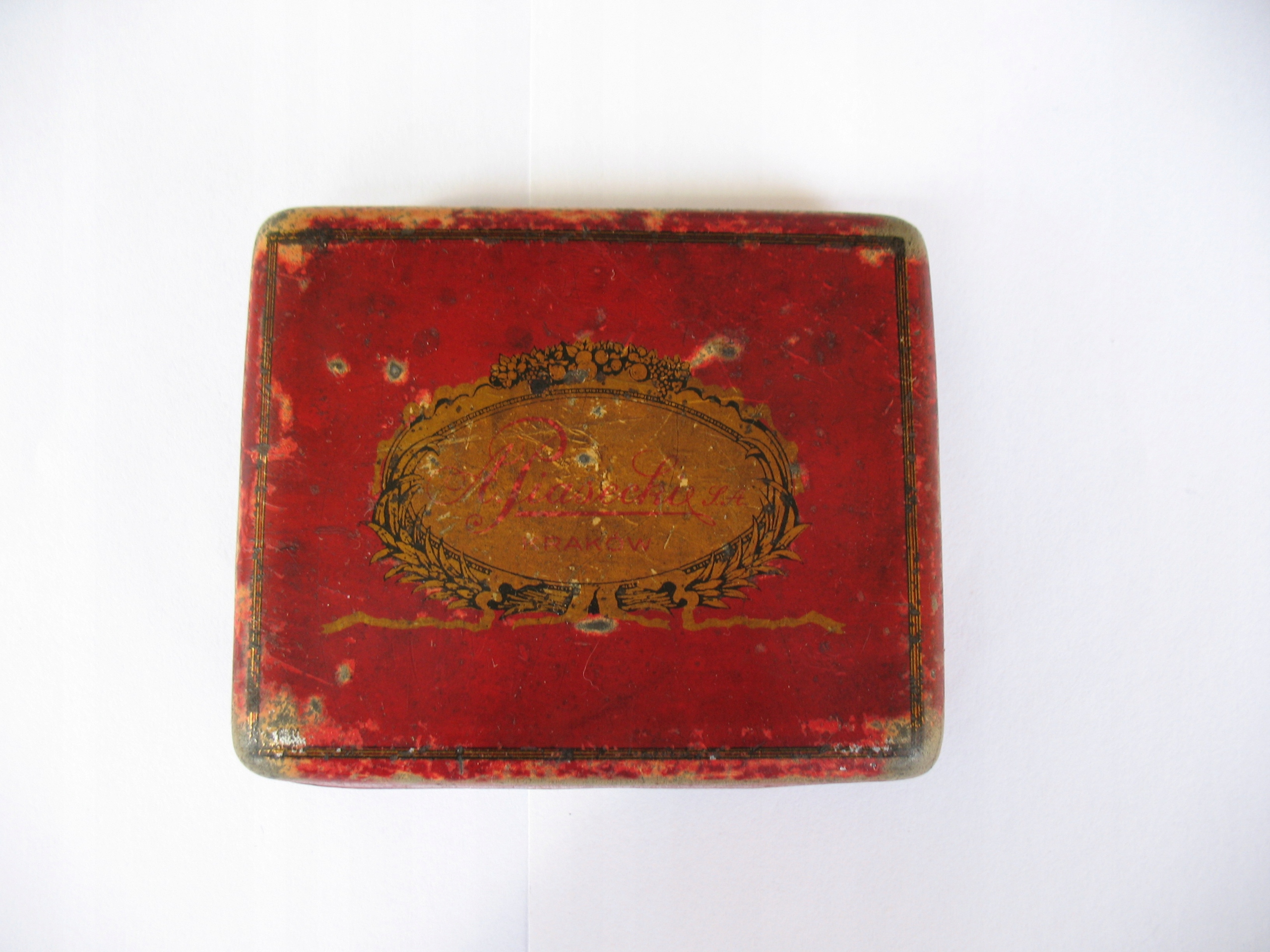 Старая, оригинальная, довоенная, пустая банка из-под конфет фирмы A. Piasecki S.A. в Кракове /нынешний Вавель/. Оригинал. Предмет из металла /листового металла/. Датировка: межвоенные годы. Размеры: 70 х 85 х 17 мм. Состояние: на мой взгляд -db/+dst, следы использования, грязь, потертости и дефекты краски, вмятины, все видно на сканах. Смело совершайте покупки.
