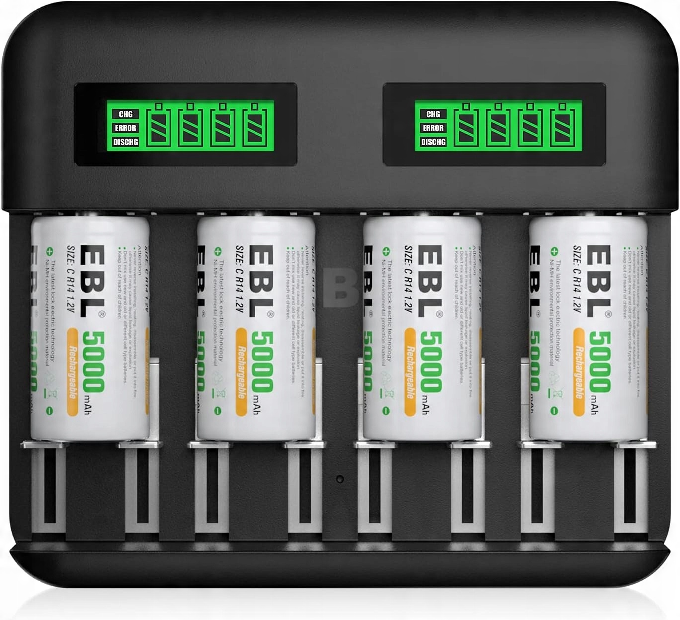 - зарядное устройство EBL с ЖК -дисплеем - зарядное устройство с интеллектуальным ЖК -дисплеем показывает весь процесс зарядки батареи AAA и C/D, когда аккумулятор полностью заряжен. Благодаря этому статус загрузки виден на первый взгляд