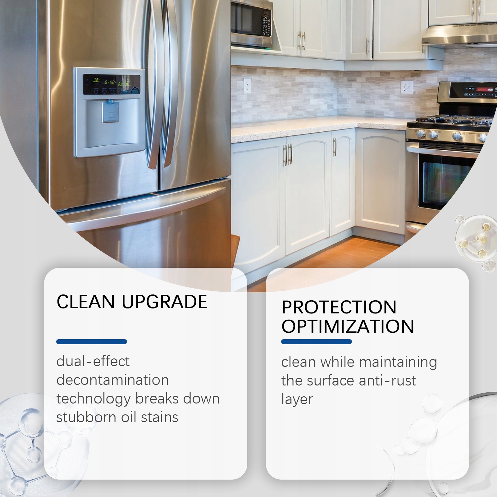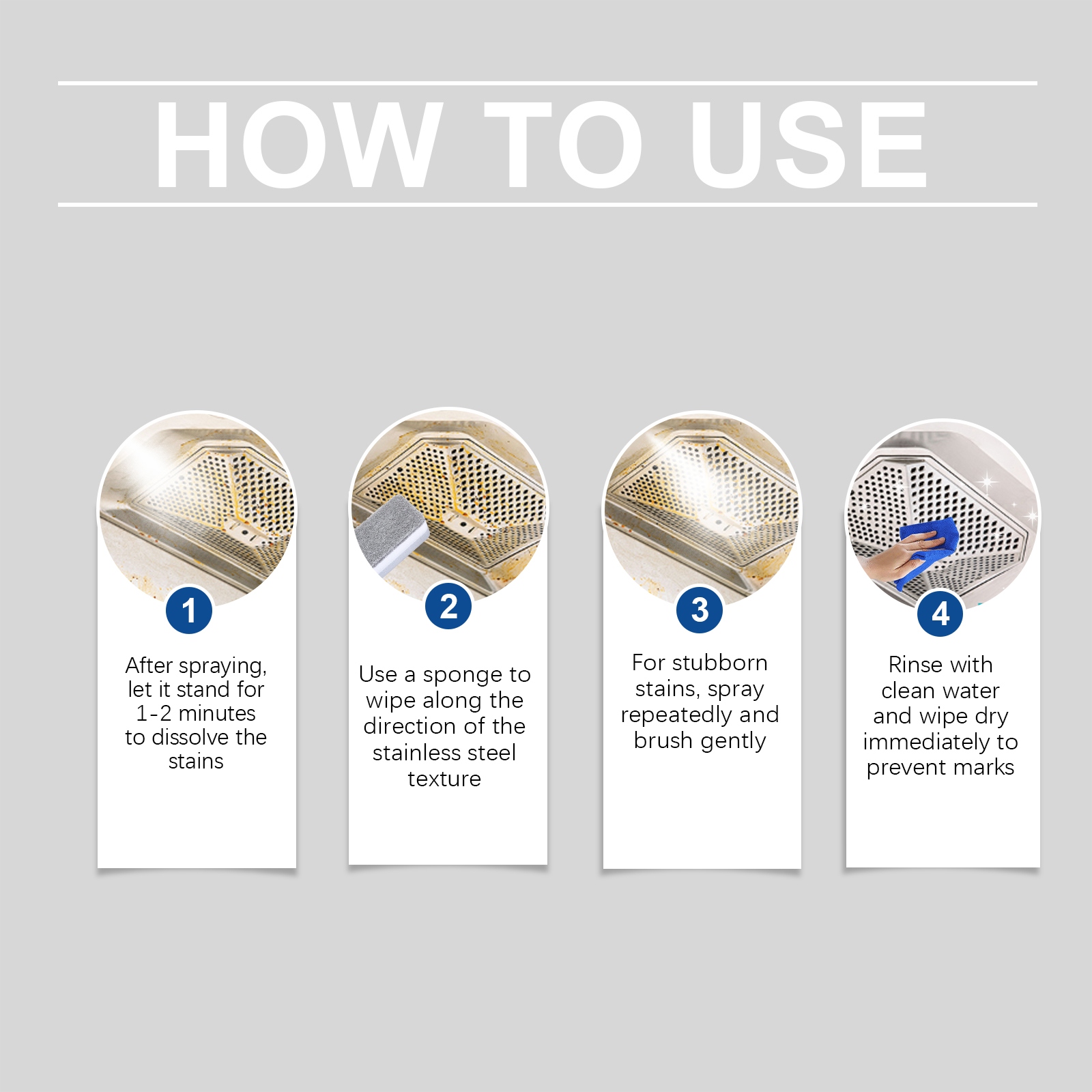 Наш спрей для очистки и полировки нержавеющей стали был тщательно развит на основе глюконата натрия, лимонной кислоты и ЭДТА -дистий. Разработано для эффективного удаления жира и отпечатков пальцев и восстановить оригинальный цвет и блеск металла. Чрезвычайно прост в использовании: оставьте после опрыскивания на 1-2 минуты, чтобы растворить пятна. Используйте губку в направлении банок из нержавеющей стали. В случае постоянных пятен, распыляйте много раз и аккуратно чистите. Промойте водой исуж и высушите немедленно, чтобы предотвратить образование трассов. Очистите слой, устойчивый к ржавчине.