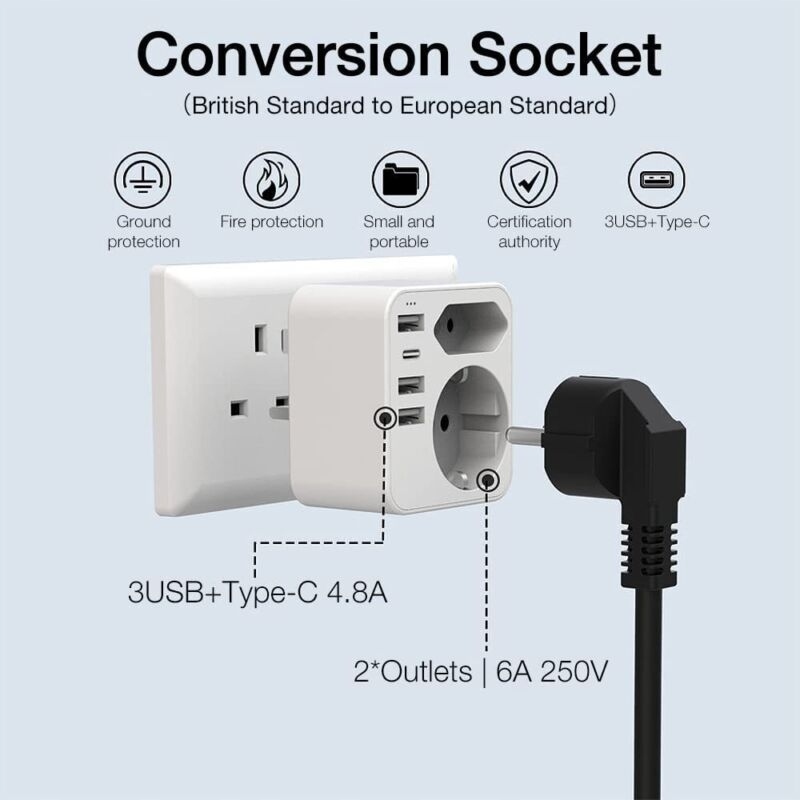 - Подходит для поездки за границу: 6 -евро -адаптер путешествий (тип C/E/F) для британского плагина G с 3 USB -портами и 1 портом типа C, 2 розетками переменного тока, может заряжать до 6 устройств, совместимых с камерами, мобильными телефонами, таблетками, ноутбуками, портативными электроэнергией, наушниками, игровыми конфесками, игровыми концепциями. и т. д.