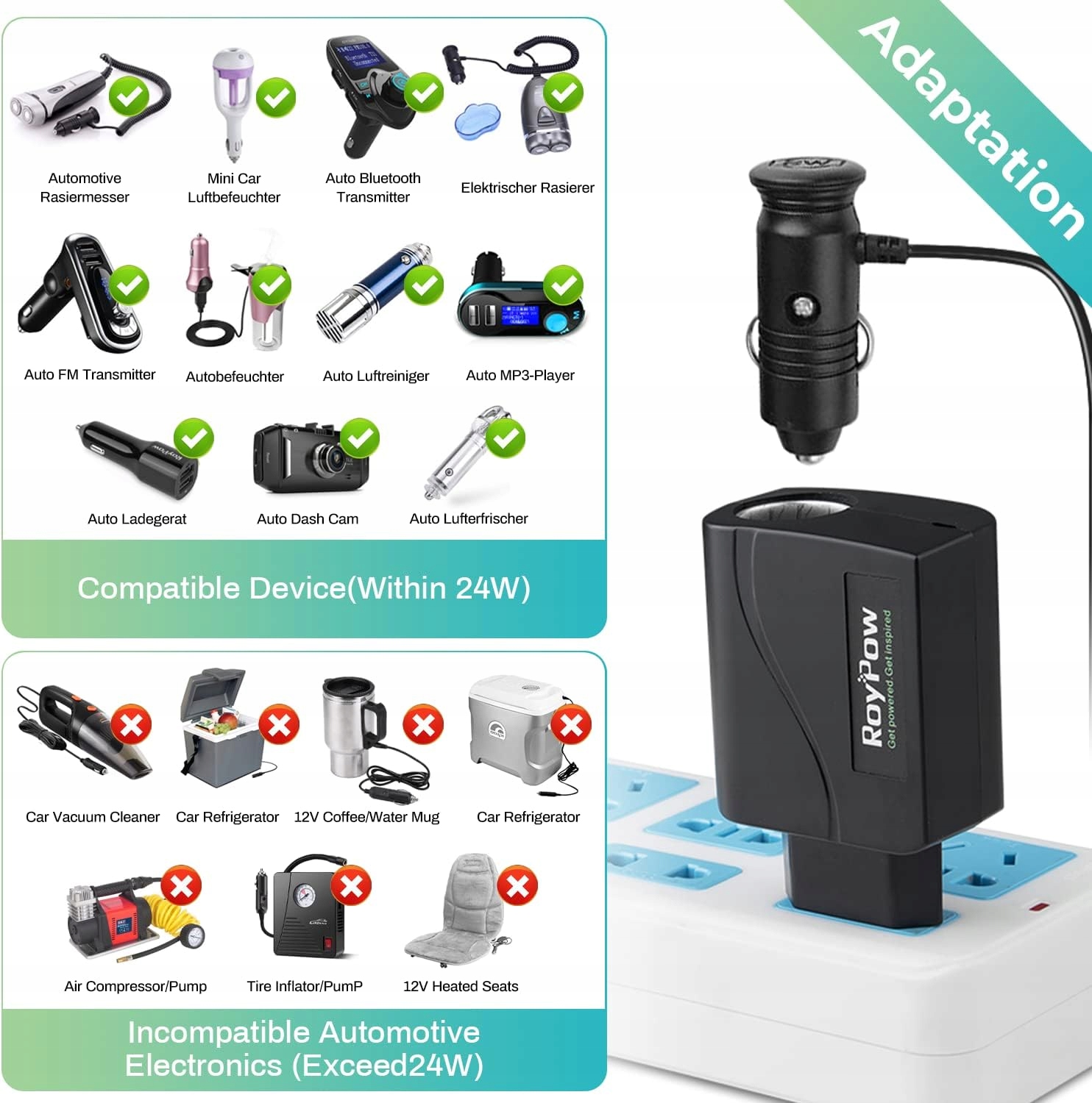 Выход 12 В 2 A соответствует большинству электронных устройств с низким содержанием мощности, таких как автомобильная камера, DVR -рекордер, MP3 -автомобиль, FM Bluetooth FM -передатчик, очиститель воздуха, увлажнитель воздуха, автомобильный телефон, автомобильное бритву, автомобильное зарядное устройство и т. Д.