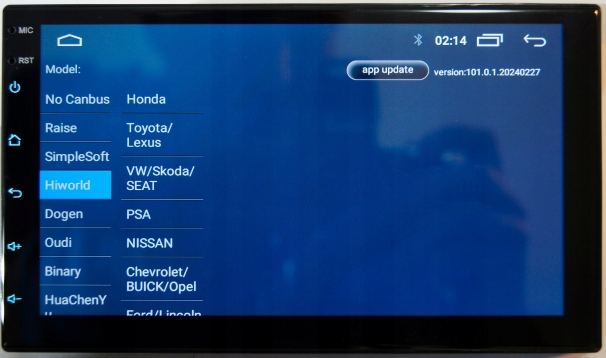Для правильной работы модуля необходимо выбрать подключенный модуль Canbus в настройках радио (по умолчанию, что нет - Hworld), затем бренд, модель и самый похожий год автомобиля, с которым он будет подключен.