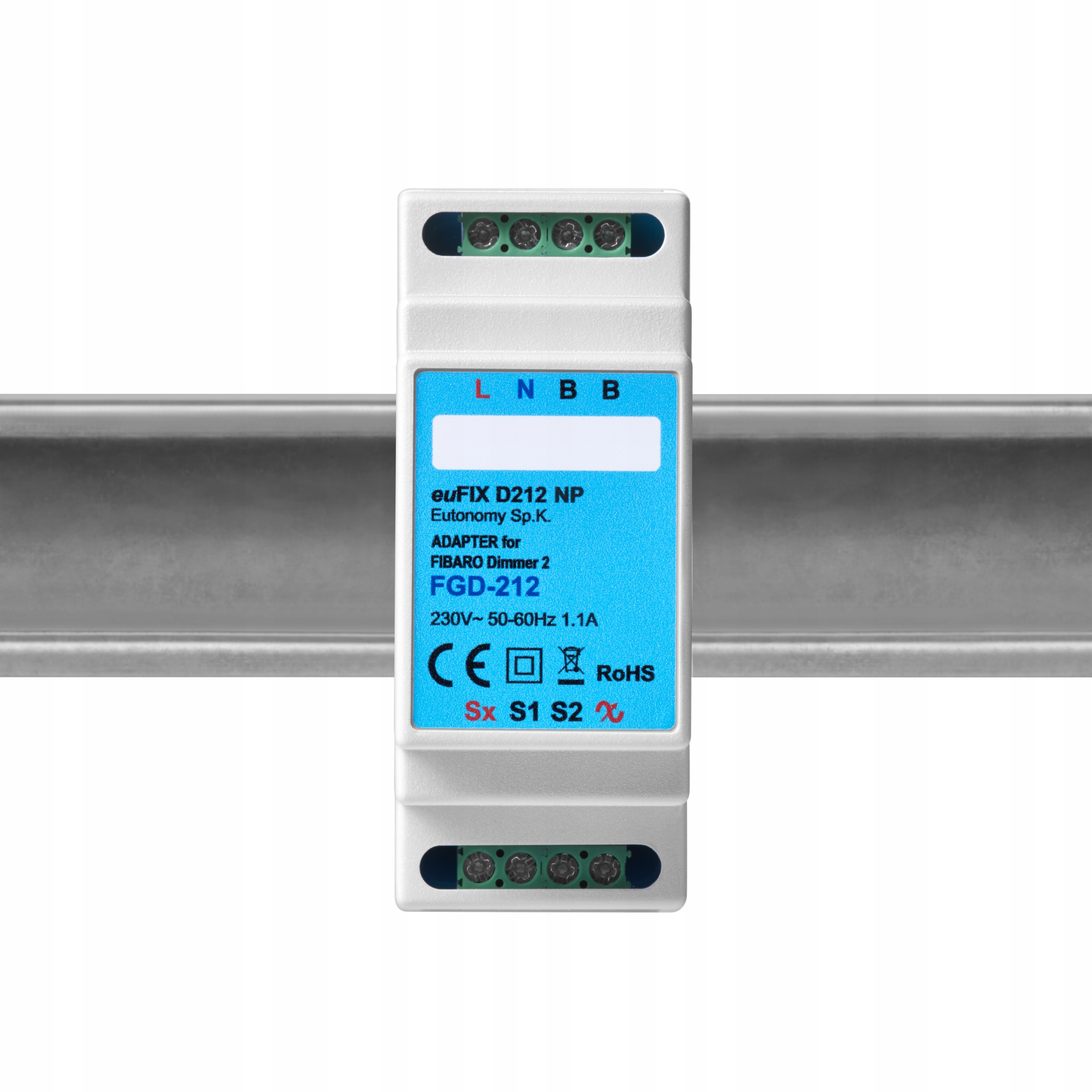 Адаптер euFIX D212 обеспечивает безопасную установку модуля Fibaro® FGD-212 в электрический распределительный щит на DIN-рейке TH35. Адаптер состоит из корпуса с размерами, адаптированными к стандартным рельсовым устройствам TH35, и опорной пластины, на которой крепится модуль FGD-212. Несущая пластина содержит винтовые клеммы, обеспечивающие надежное подключение источника питания, входных и выходных сигналов, а также кнопок управления и дополнительного модуля Fibaro® Bypass FGB-002. В верхней части корпуса расположены микрокнопки S1 и S2, позволяющие управлять модулем в диагностических целях. Кнопка S1 также позволяет зарегистрировать модуль в системе Z-Wave или удалить его из системы, не вынимая из адаптера. Версия D212NP не имеет микрокнопок. Модули Fibaro® FGD-212 и FGB-002 не входят в комплект и приобретаются отдельно.