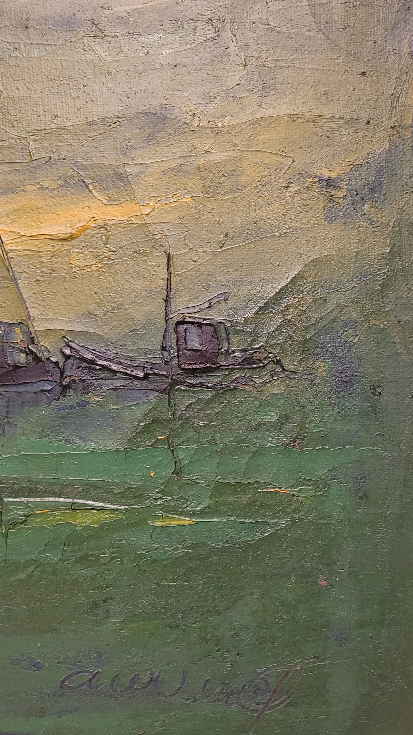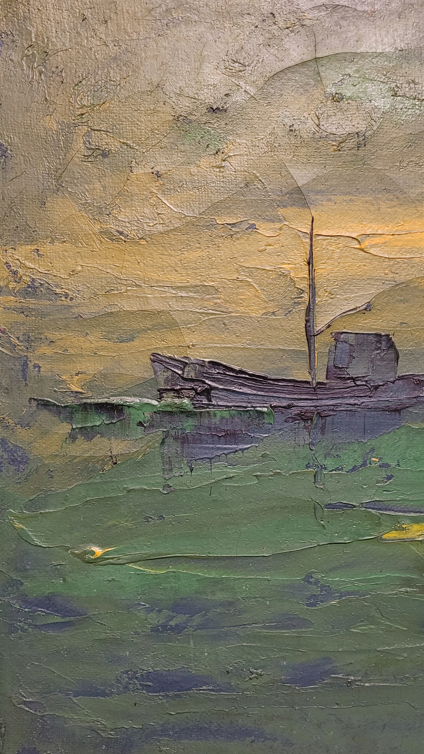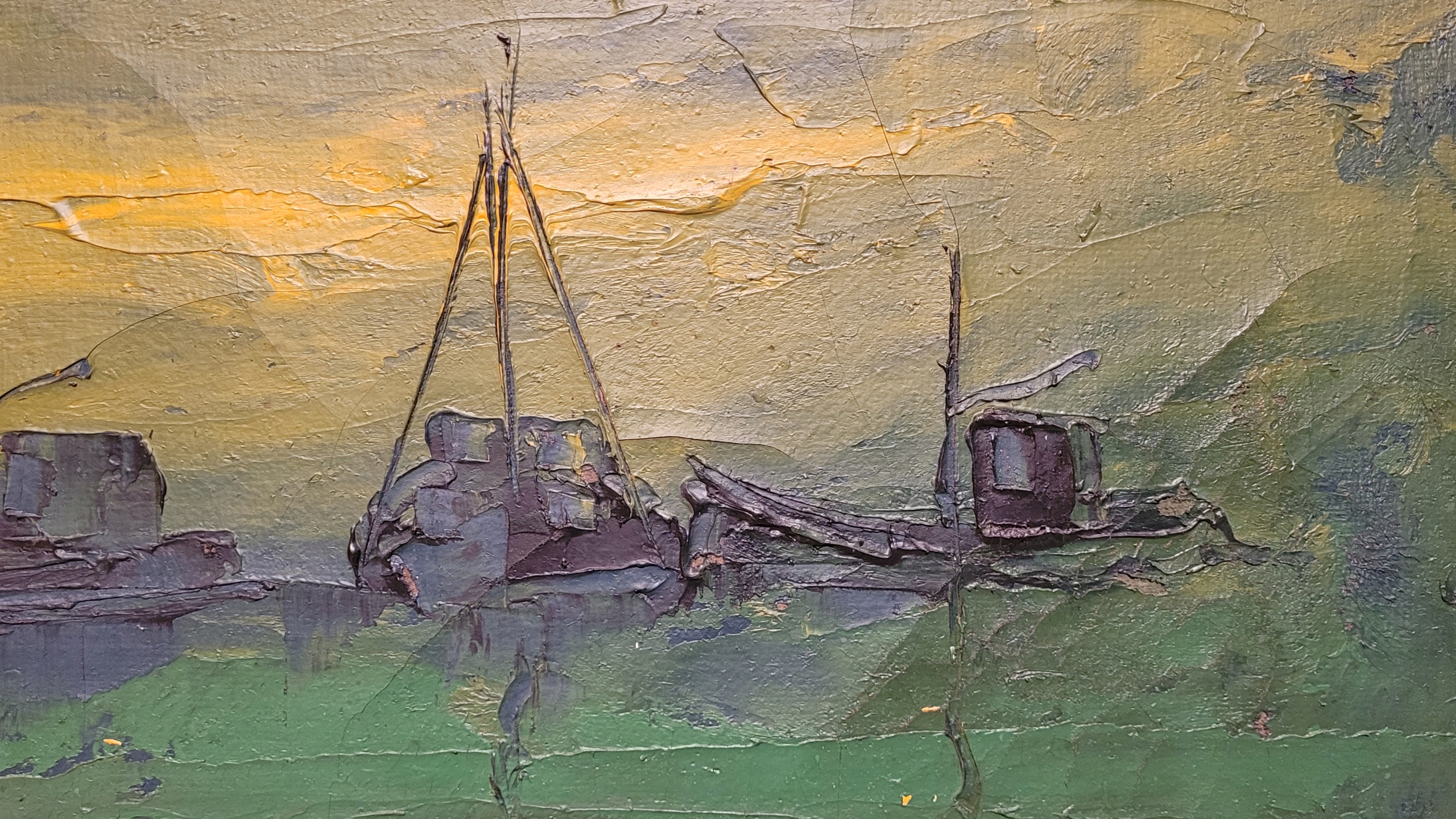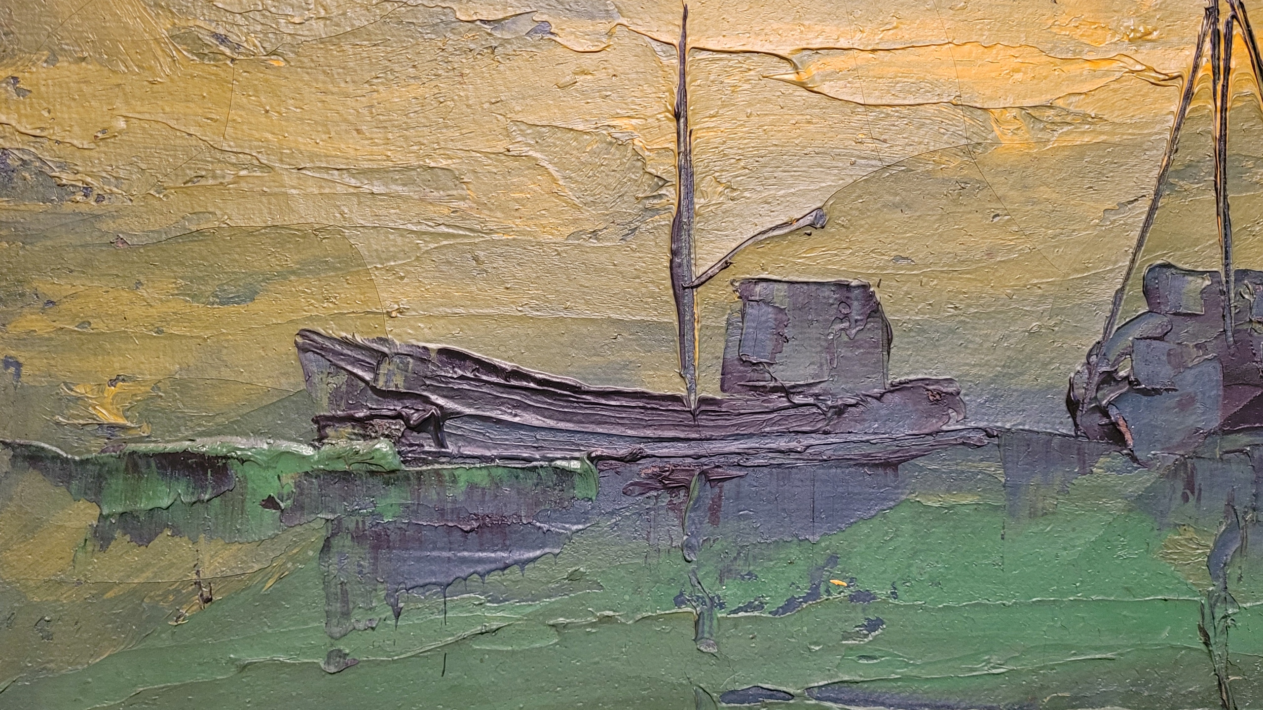 Тема продажи - это красивая старая масляная картина "лодки в темноте".