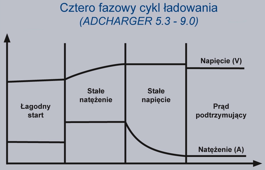 Модель ADCHARGER 5.3 имеет опцию выбор зарядного напряжения и типа аккумулятора.