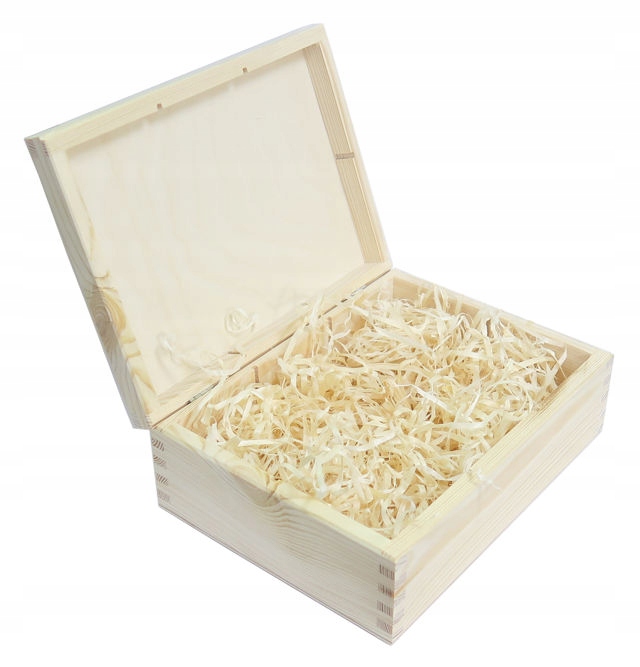 Мы предлагаем деревянную коробку в сочетании с детской метрикой, заполненной деревянной шерстью.