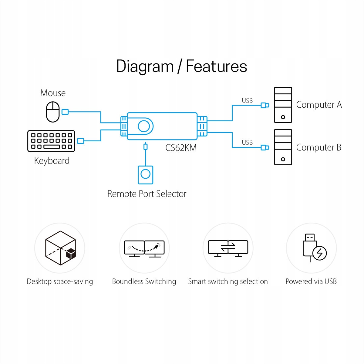 CS62KM предлагает несколько инновационных методов выбора порта, который позволяет пользователям переключаться между подключенными компьютерами, используя селектор внешнего порта, клавишу клавиши, индикатор мыши и колесо мыши. Метод индикатора мыши использует уникальную технологию безграничного переключения в Афинах, которая обеспечивает интуитивно понятный способ переключения управления на другой компьютер, просто перемещая индикатор мыши через границу экрана на монитор на целевой монитор компьютера без ограничений.