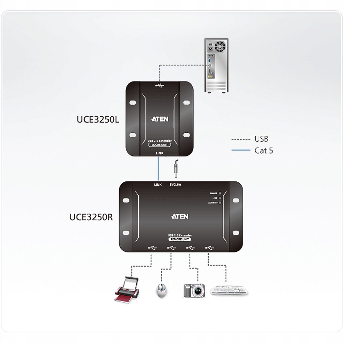UCE3250 Удлинитель 4-порт USB 2.0 Cat 5-это устройство с двумя частями, которое выполняет функцию USB-концентратора и удлинитель USB. UCE3250 может подключаться к 4 USB -периферийным устройствам до 50 метров с Ethernet Cat 5/5E/6.