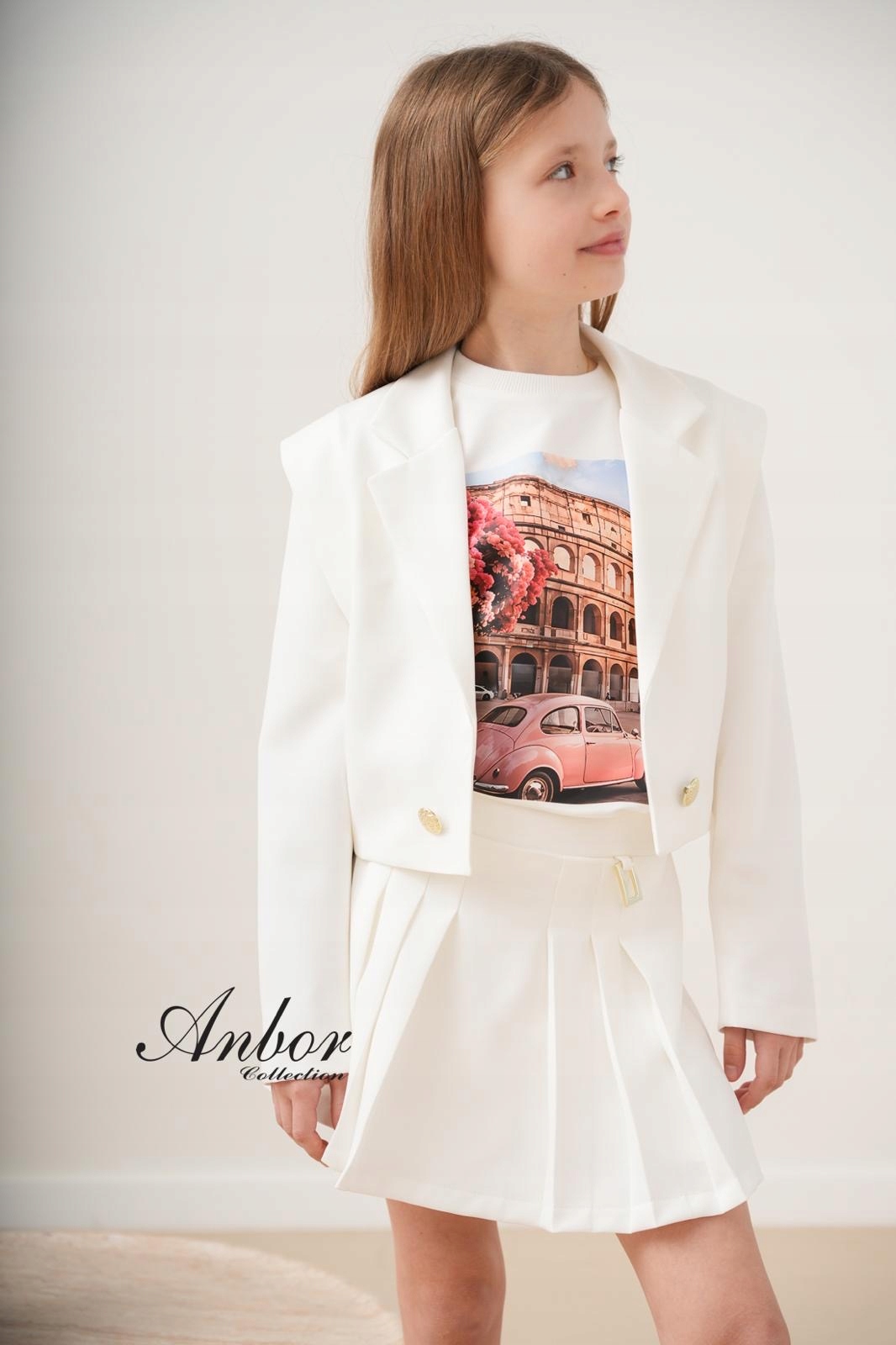 Костюм этой девушки - элегантный, современный набор в тонком оттенке Ecru. Он состоит из короткой куртки с простым, слегка негабаритным разрезом и золотыми пуговицами в качестве декоративного акцента.