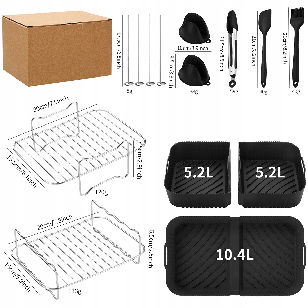 -air fryzer fryker аксессуары, включающие в себя 1 x 10,4-литровые силиконовые вставки для картофеля фри, 2 x 5,2-литровый силиконовый вставки, 1 x stainless, 1 x stainless, 1 x stainless, x stainless, x stainless, x stainless, 1 x stainless, 1 x stainless, 1 x stainless, 1 x stainless, 1 x stainless, 1 x stainless, 1 x stainless, 1 x stainless, 1 х. 1 x анти -слабый клип, 2 x силиконовые перчатки и 1 х силиконового шпателя. Сэкономьте время и усилия при приготовлении шашлыков, стейков, овощей, картофеля, пиццы, жареных котлетов и других блюд.