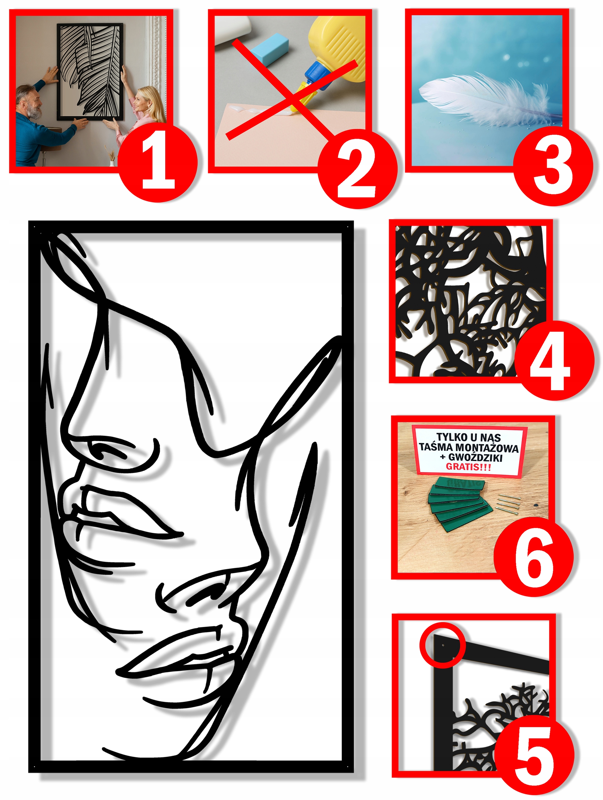 - В комплект входит набор лент, самоклеящихся элементов крепления и гвоздей (2 способа крепления на выбор!!!), благодаря которым можно очень легко повесить картину li>