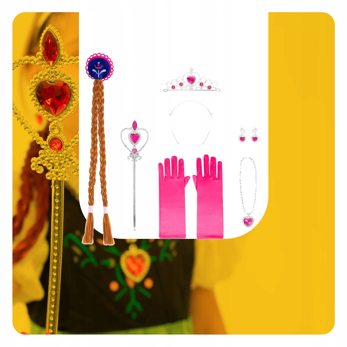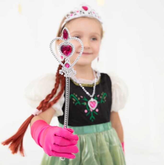 ➡️ В комплект входят корона, палочка, перчатки, серьги и прикрепленные косы - набор аксессуаров, которые сделают игру принцессы еще более реалистичной и очаровательной. Тщательно подобранные элементы позволяют создать законченную укладку, а их сказочный характер порадует каждого маленького поклонника Анны из «Холодного сердца».