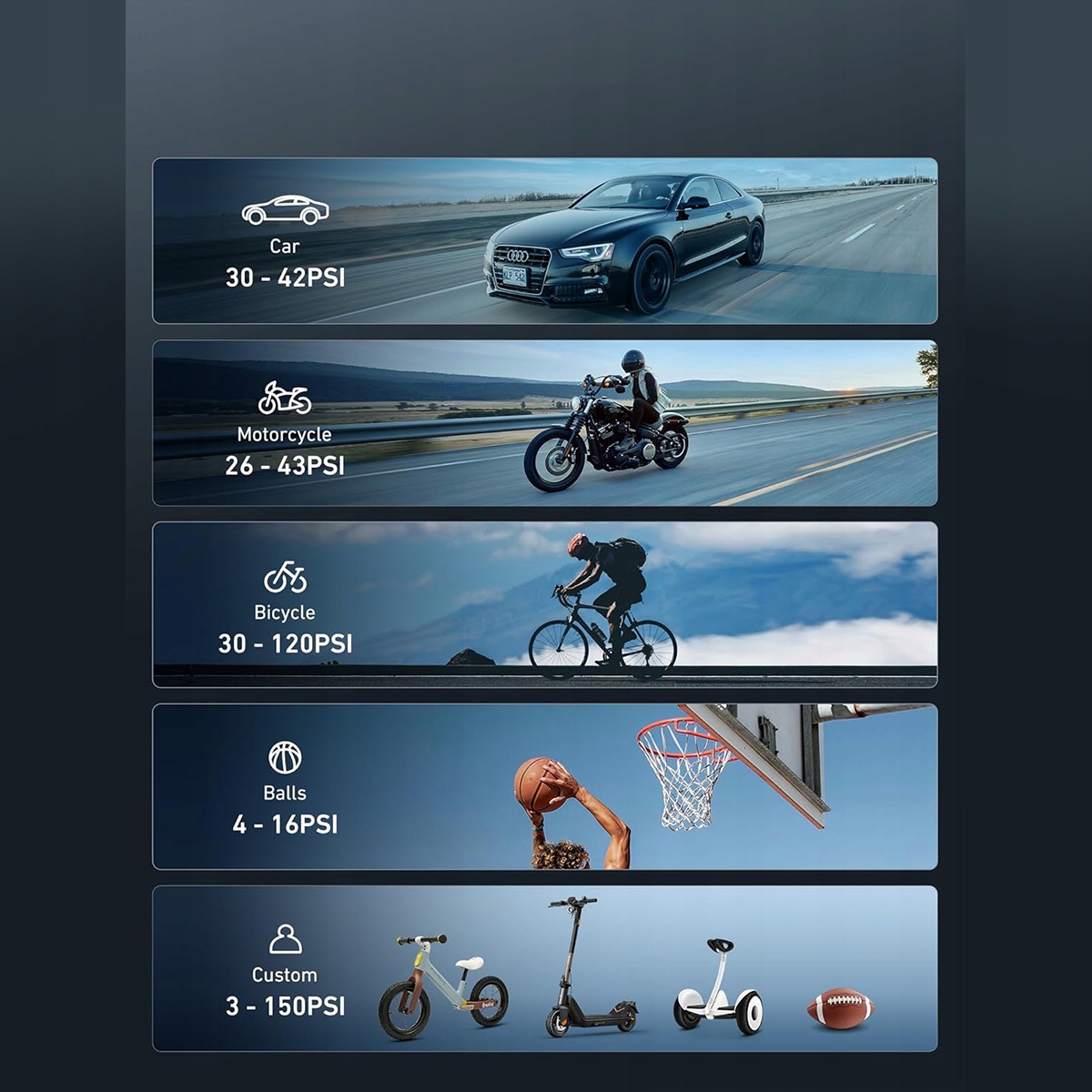 В соответствии с вашими потребностями вы можете выбрать один из 4+N интеллектуальных режимов (автомобиль, мотоцикл, велосипед, мяч и ручной режим). Вы также можете выбрать одну из 4 единиц измерения давления (PSI, бар, кПа, кг/см²). В ручном режиме вы можете отрегулировать желаемое значение давления (3–150 фунтов на квадратный дюйм) в зависимости от типа надуваемого объекта.