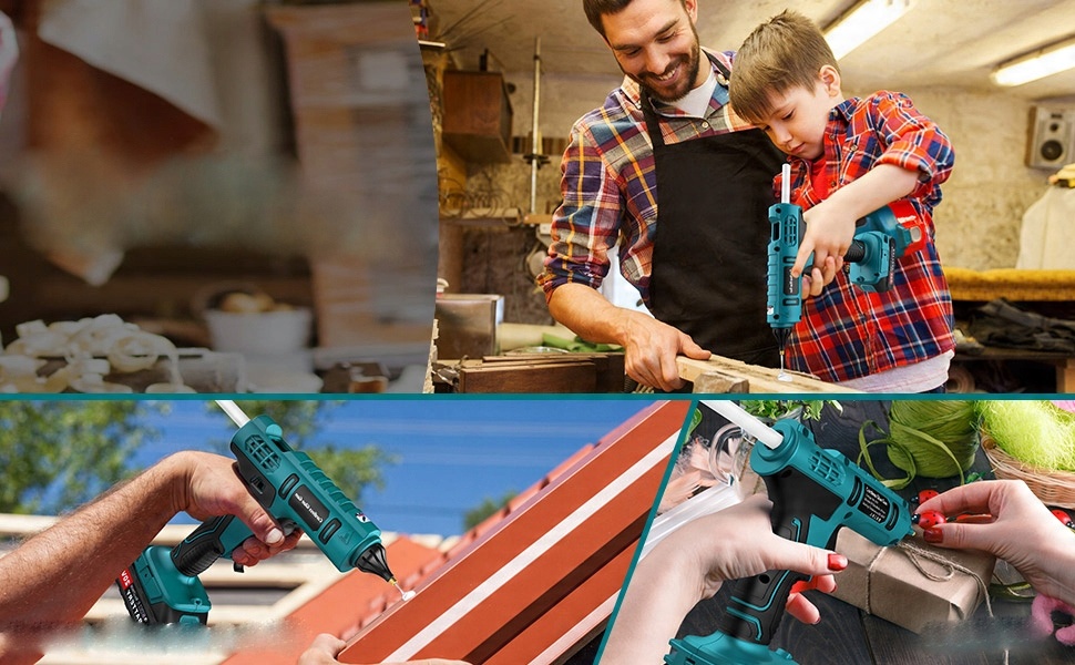 - ✅【Широкое применение】 Десять беспроводных клеевых пистолетов идеально подходят для различных работ «сделай сам», таких как поделки, искусство, предметы домашнего обихода, изготовление предметов для дома и подарки. Он хорошо работает с пластиком, стеклом, бумагой, хлопком, тканью и другими материалами.