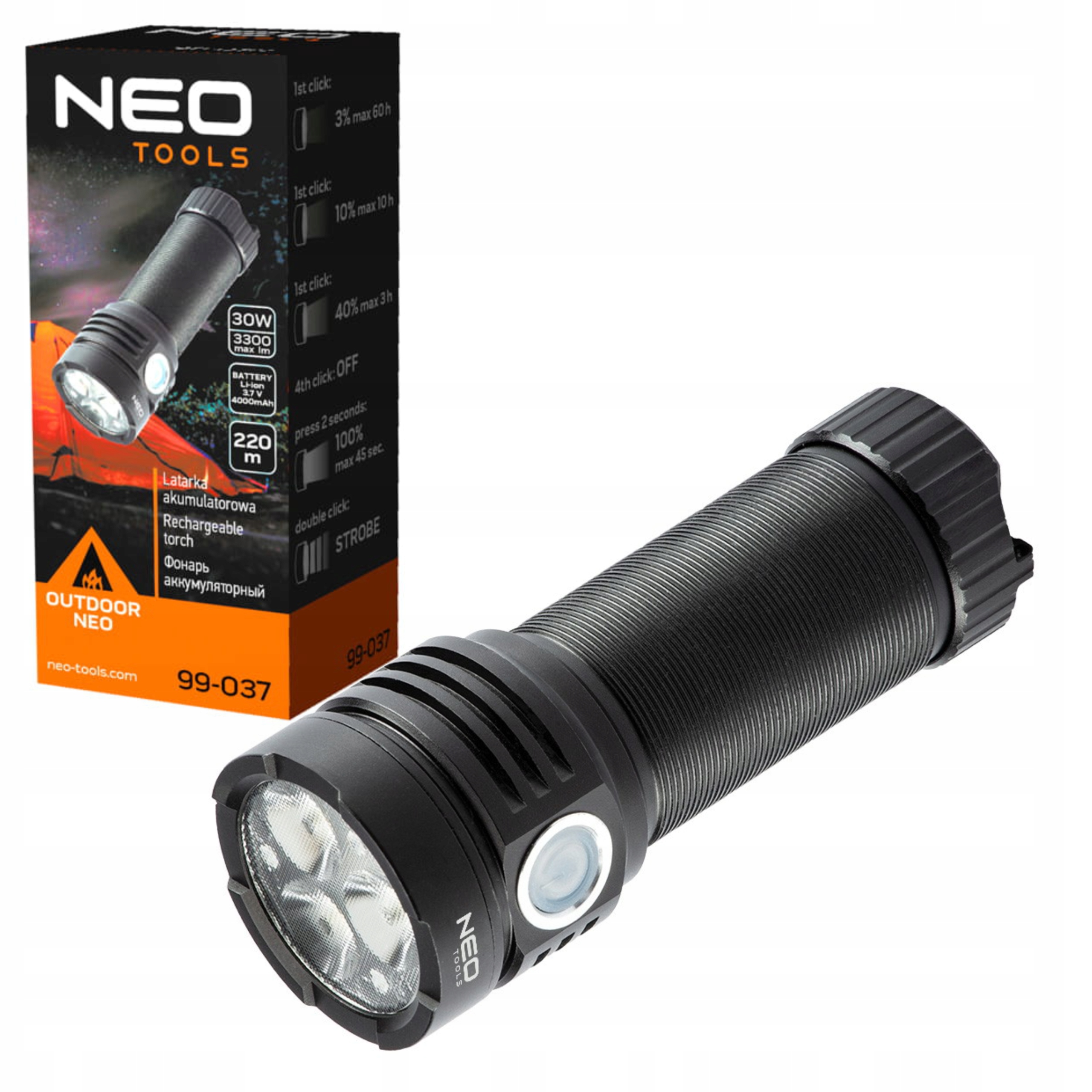 Фонарик NEO отличается прочной конструкцией. Корпус изготовлен из алюминия. Он оснащен современными светодиодами OSRAM P9 со световым потоком 3300 люмен и мощностью 30 Вт. Фонарик имеет 5 функций освещения: 100% фонарик/40% фонарик/10% фонарик/3% фонарик и стробоскоп. Продукт имеет широкий спектр применения, например, дома, в автомобиле, подвале, кемпинге. Соответствие европейским стандартам безопасности гарантируется сертификатом CE.