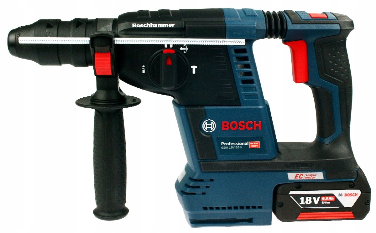 Профессиональная ударная дрель BOSCH GBH 18V-26F – это специализированное устройство, обладающее невероятно высокой производительностью и эффективностью работы. По своим техническим параметрам он сравним с электродрелью-перфоратором. Оптимизированный ударный механизм с функцией ковки позволяет сверлить отверстия в бетоне максимальным диаметром 26 мм (оптимальный диапазон от 8 до 16 мм), а благодаря высокой энергии удара - 2,6 Дж, по скорости не уступает электрической ударной дрели класса 2 кг ( например GBH 2).-28 DFV от BOSCH).