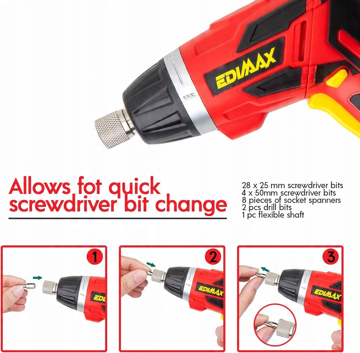 Беспроводная отвертка EDIMAX оснащена 3,6 В, регулировкой крутящего момента -6+1 градус, поворотной ручкой, контролем вращения вперед/назад, световым индикатором зарядки, портом для зарядки аккумулятора, фонариком, кабелем USB и зарядным устройством. .