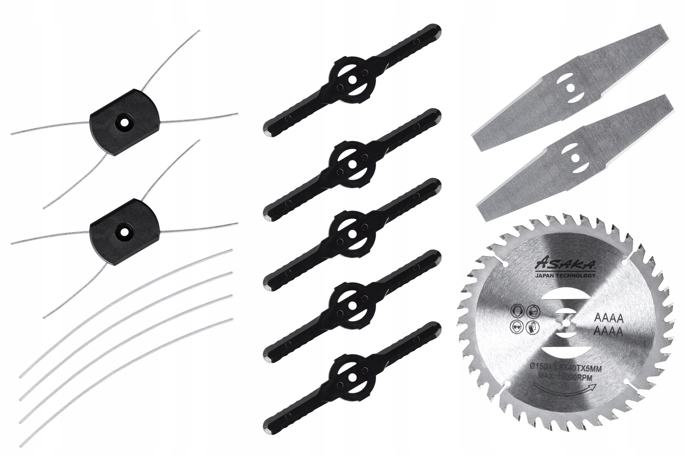 Набор В комплект входят все необходимые аксессуары, благодаря которым триммер готов к работе сразу после извлечения из коробки. В комплект входят отрезные диски, ножи из нержавеющей стали, пластиковые лезвия, лески для резки, прокладки, винты и гаечный ключ.