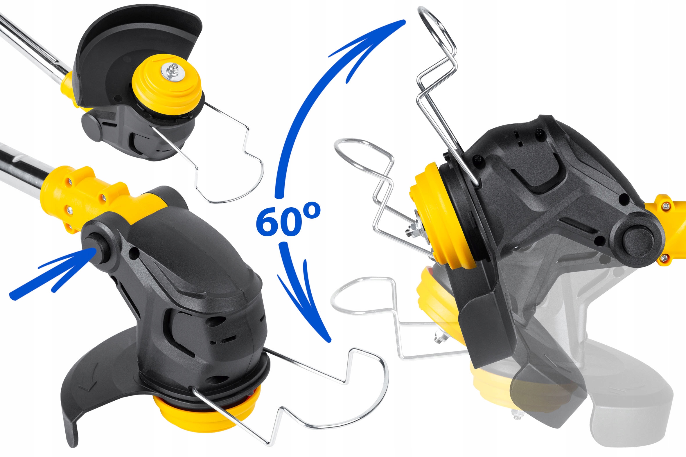 - Регулируемая режущая головка в 3-х положениях: Позволяет точно скашивать в труднодоступных местах и адаптироваться для различных задач.