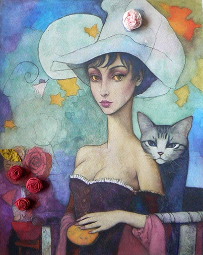 Изображение леди с кошкой, окрашенной матовой и металлической акварелью, на акварельной бумаге с весом 250 г/м2