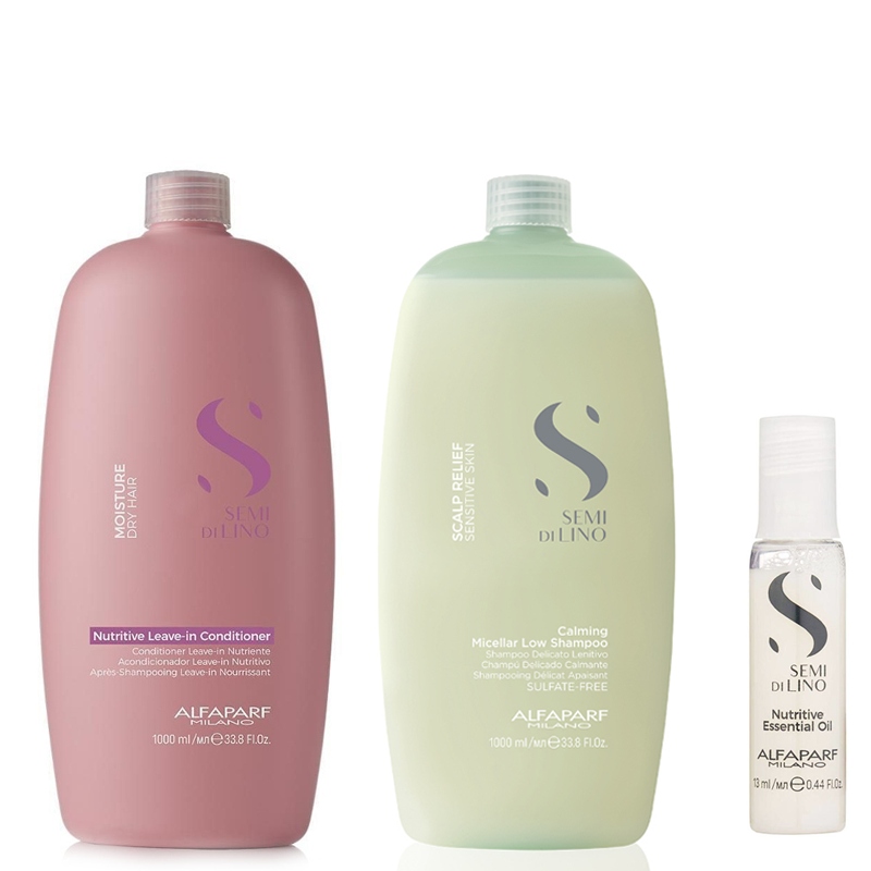 Alfaparf SDL Moisture Dry Hair Nutritive Несмываемый кондиционер 1000 мл + Alfaparf SDL Scalp Relief Успокаивающий мицеллярный шампунь с низким содержанием влаги 1000 мл + Alfaparf Semi Di Lino Moisture Nutritive 13 мл
