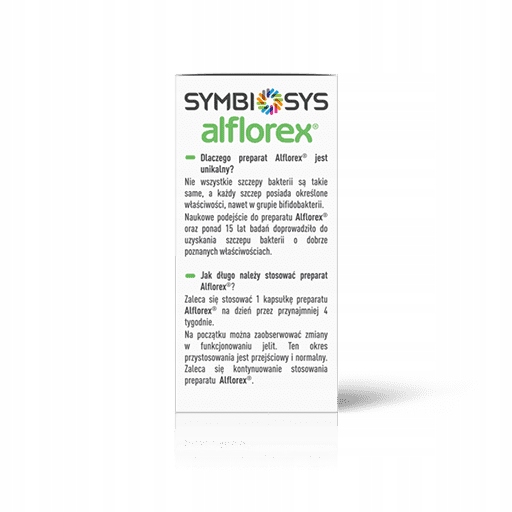 SYMBIOSYS Alflorex ® — это пищевая добавка, которая поддерживает баланс кишечной микробиоты. SYMBIOSYS Alflorex — единственный препарат в Европе, содержащий уникальный штамм Bifidobacterium infantis 35624®, выделенный из желудочно-кишечного тракта здорового человека. Штамм 35624® в течение 15 лет тщательно изучался компанией Alimentary Health Ltd. и Институтом микробиома APC, одним из ведущих в мире институтов кишечника. Без лактозы, без глютена, подходит веганам.