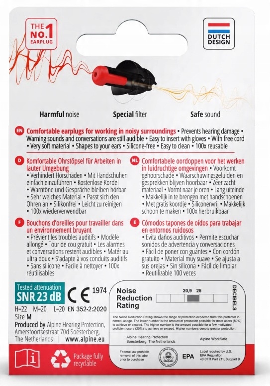 Специальные акустические фильтры в берушах WorkSafe обеспечить дополнительное шумоподавление, которое блокирует все вредные звуки, издаваемые машинами. Шум снижается до безопасного уровня, который хорошо переносится в течение восьми часов. Благодаря сложным фильтрам AlpineAcousticFilters вы по-прежнему можете разговаривать со своим коллегой. Звуки сигналов тревоги также остаются слышимыми.