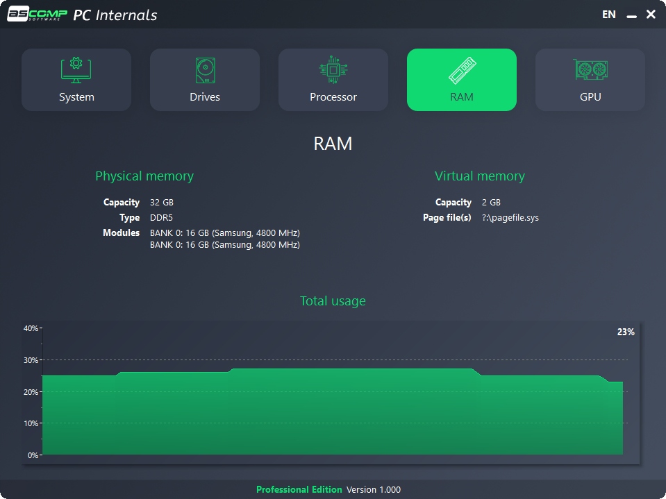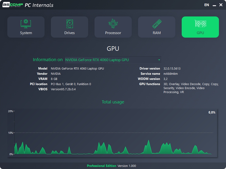 Приложение PC Internals предоставляет конечным пользователям подробное представление о процессоре, памяти, видеокарте и дисках, включая интеллектуальную, SSD -дисковую операцию