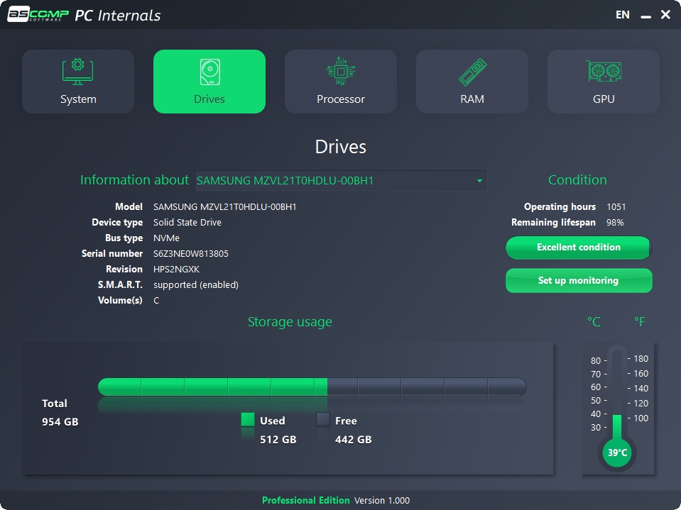 - monitoring of hard drives: Smart values, temperature and life of SSDs in SSD Real -time assessment: Live display data on the use and system
